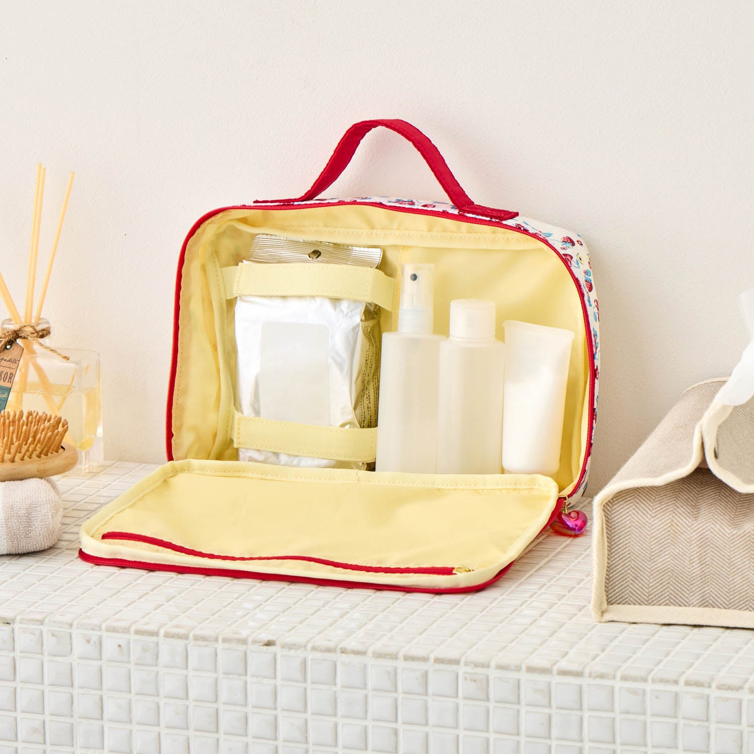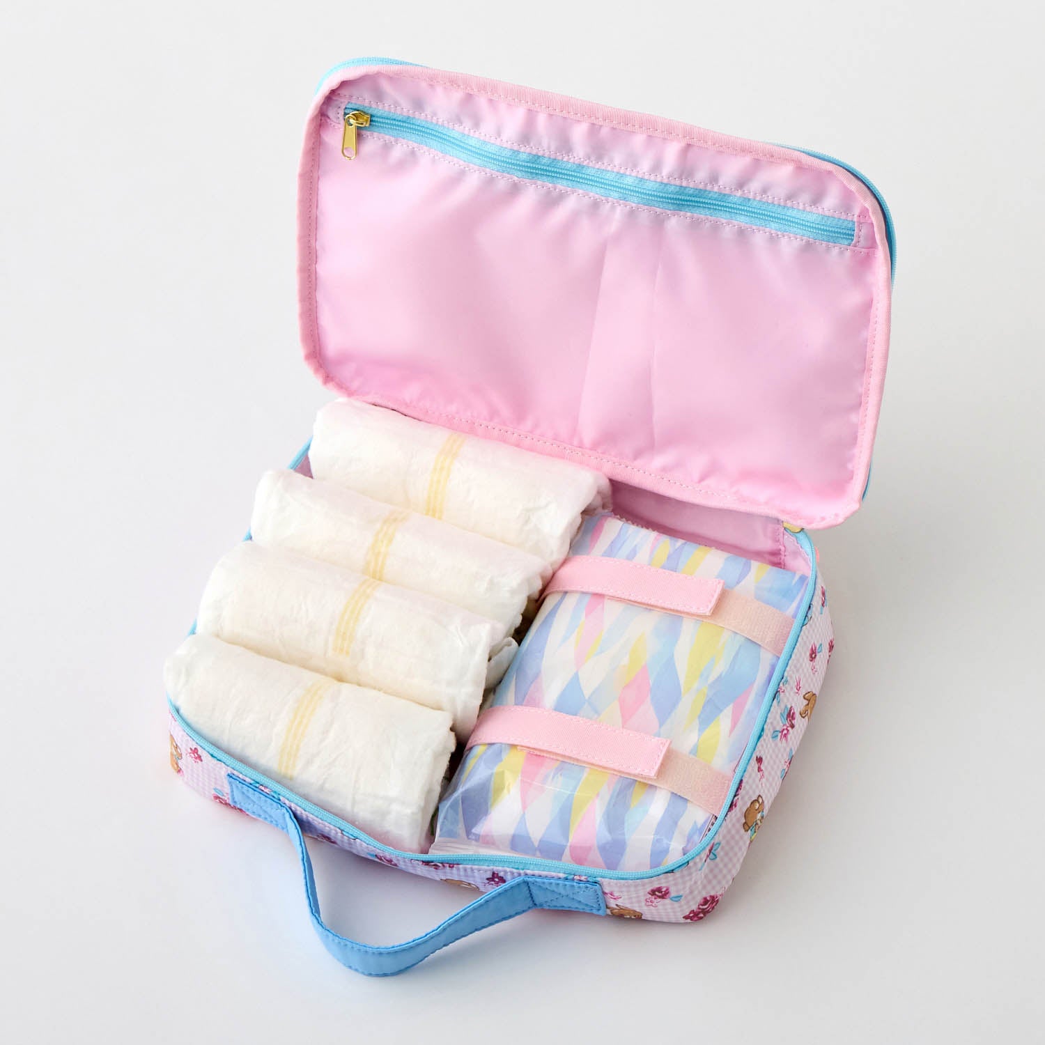 やわらか素材で収納しやすく、持ち手付きでスリムに持ち運べるおむつポーチ。内側には使用済みおむつなどを入れるのにも便利なジッパー付きポケット、おしりふき固定用テープ付き。お着替え入れやトラベルグッズ入れとしても重宝します。