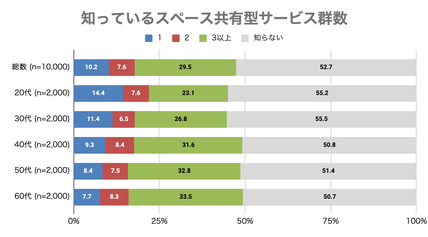 ・スペース共有型サービス群については、全世代において約半数が知っている。