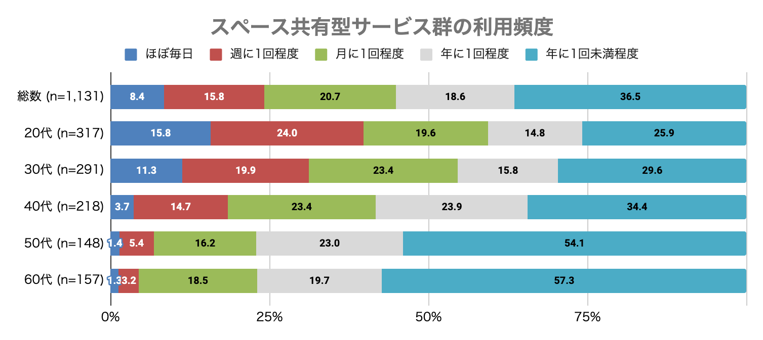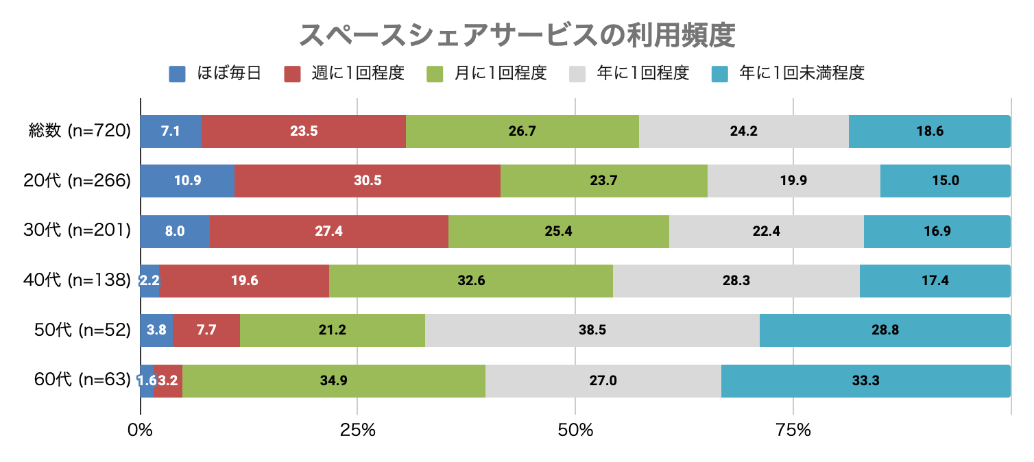 - スペースシェアサービスの利用頻度は20代-30代が最多。