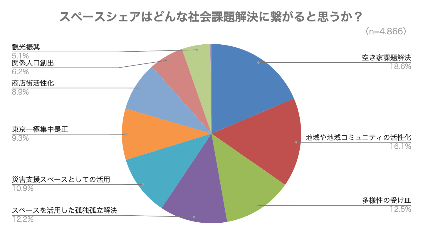 また、社会課題解決への期待の中でも「多様性の受け皿」が「空き家課題解決」「地域活性化・地域コミュニティ活性化」に次いで第3位になり、多種多様なスペースが使いたい時に使えることで多様なライフスタイル・ライフステージを支えるインフラになるであろう期待を表していると言えます。