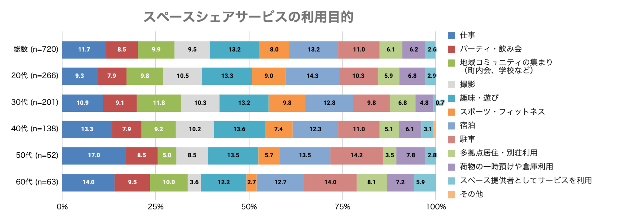 ・スペースシェアサービスは、全世代において利用目的は多用途。