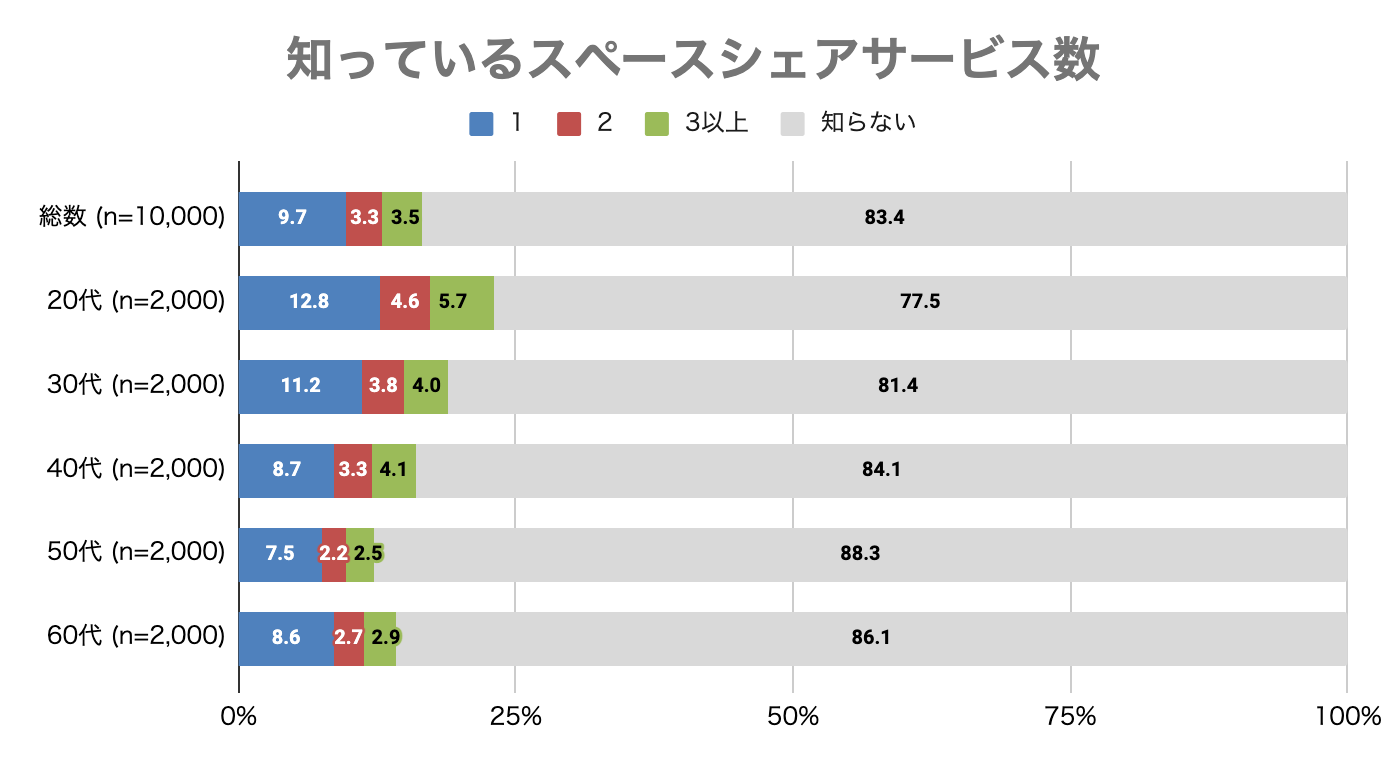 ・スペースシェアサービスについて、20代は5人に1人が知ってる。