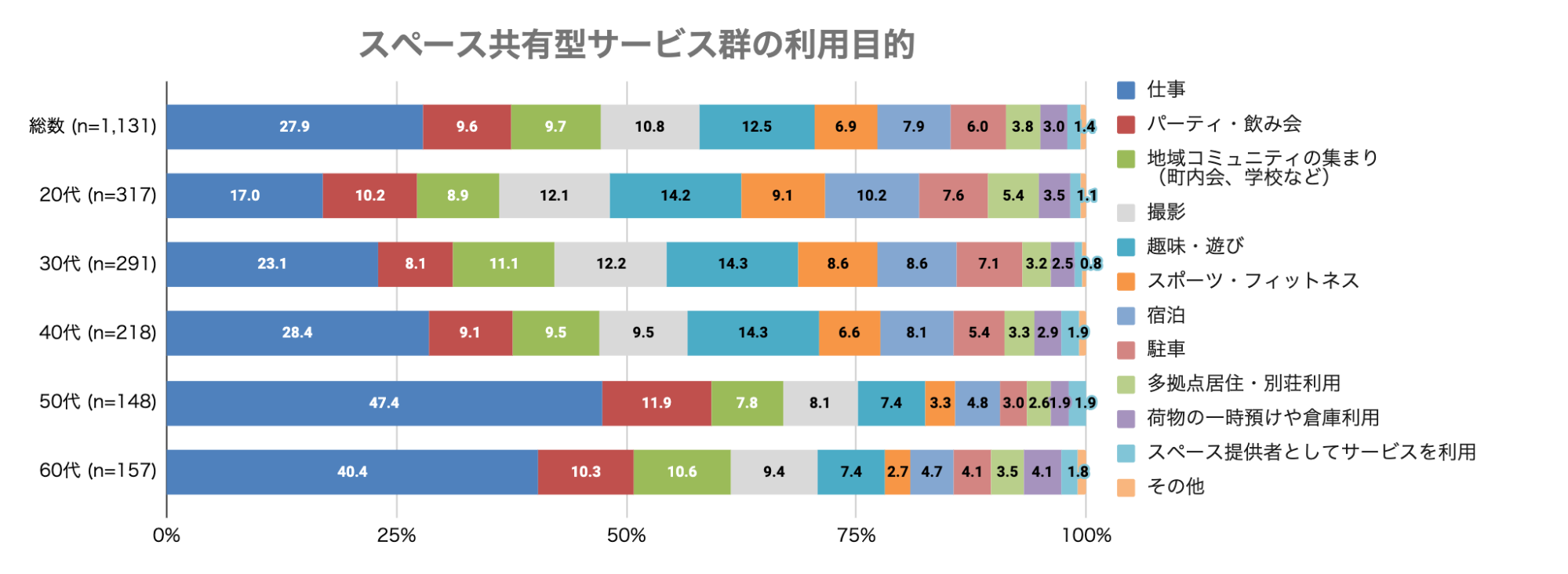 ・スペース共有型サービス群はスペースシェアサービスと比較して、全世代における「仕事」での利用割合が大きい。