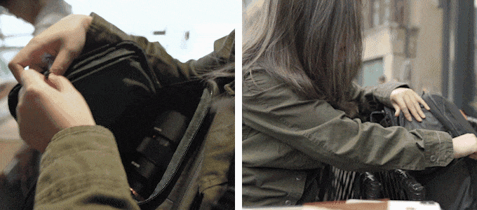 ジッパー付きのサイドポケットはスキミングや誤作動からカード型電子マネーを守る「RFIDプロテクト」対応で、カードやパスポートなどの貴重品収納におすすめ。他にはモバイルバッテリーなど電子機器を取り出し易いクイックアクセスサイドポケットや三脚も収納できる大型ポケット&ストラップタイプまで完備しています。