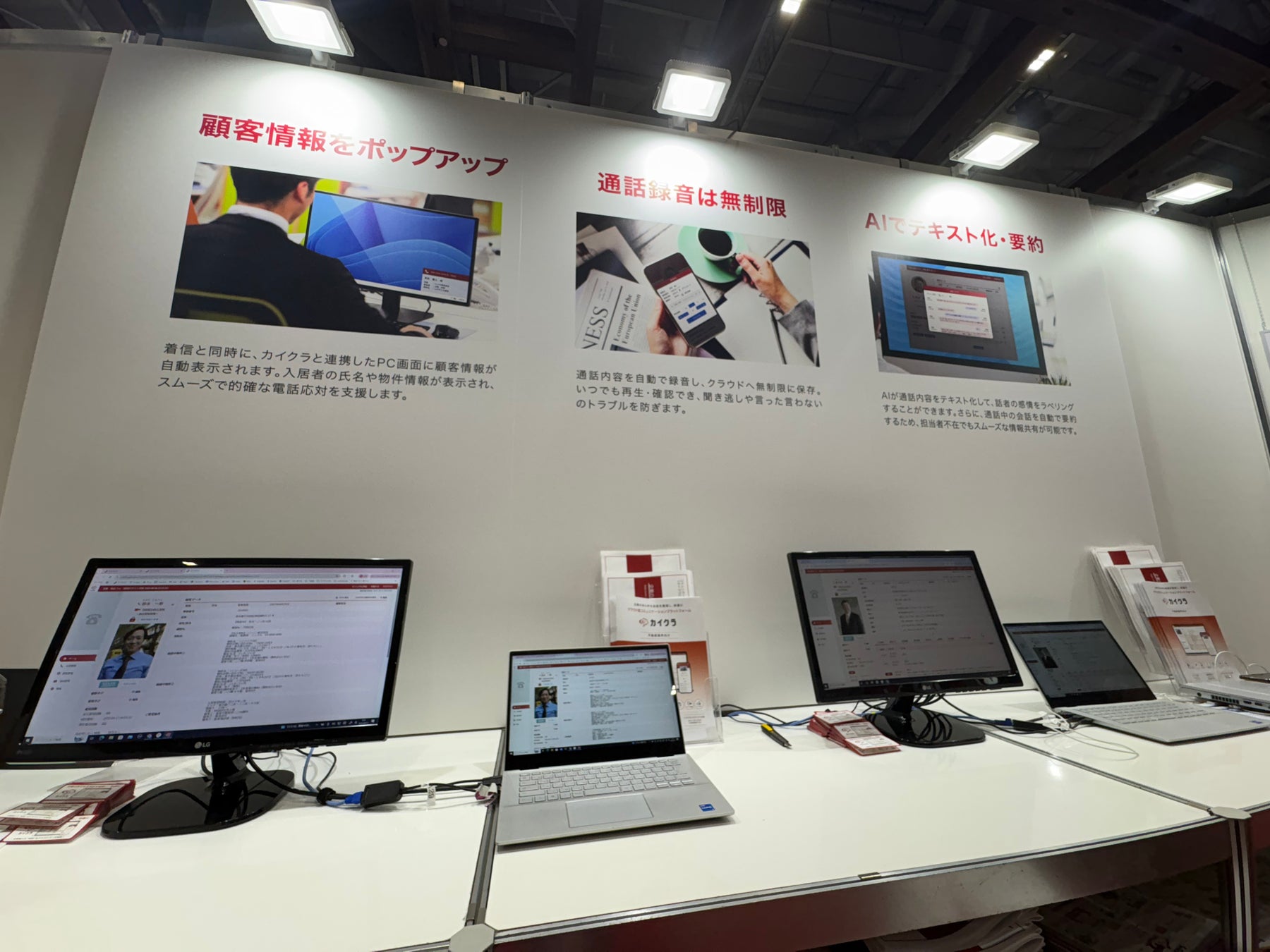 2025年9月17日(水)〜18日(木)の展示会期間中、当社の展示ブースには、特に不動産仲介・管理業の皆様から入居者管理の効率化やオーナー報告業務の改善を求める多くのお客様にご来場いただきました。会場では、カイクラの主要機能であるCTI機能、通話録音、AIによる要約・テキスト化、SMS配信、Web会議機能などをご紹介し、管理業務の現場で実際に起きている顧客対応の課題に対して、どのように解決できるのかを具体的にご案内しました。