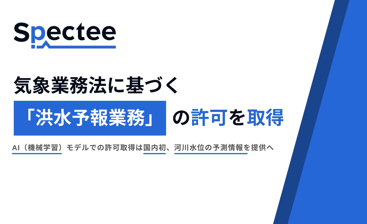 防災テックスタートアップの株式会社Spectee(東京都千代田区、代表取締役:村上建治郎、読み:スペクティ、以下「Spectee」)は、2025年1月6日に、気象庁より、気象業務法に基づく民間事業者による洪水予報業務の許可を取得したことを発表します。