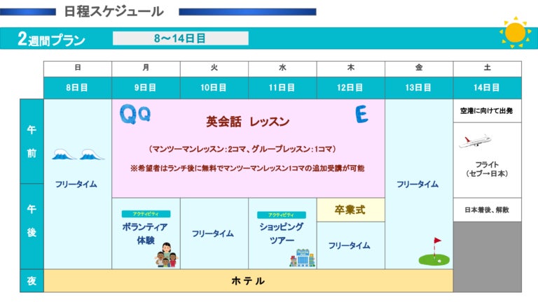 ※1週間コースにご参加の方は8日目の日曜が帰国フライトのスケジュールとなります。