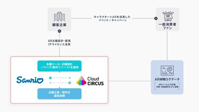 る企画設計・ディレクションまで一気通貫したAR活用ノウハウをサンリオに提供します。また、企画ごとにARコンテンツ(画像/動画/3DCG等)の制作をクラウドサーカスが請け負い、提供します。