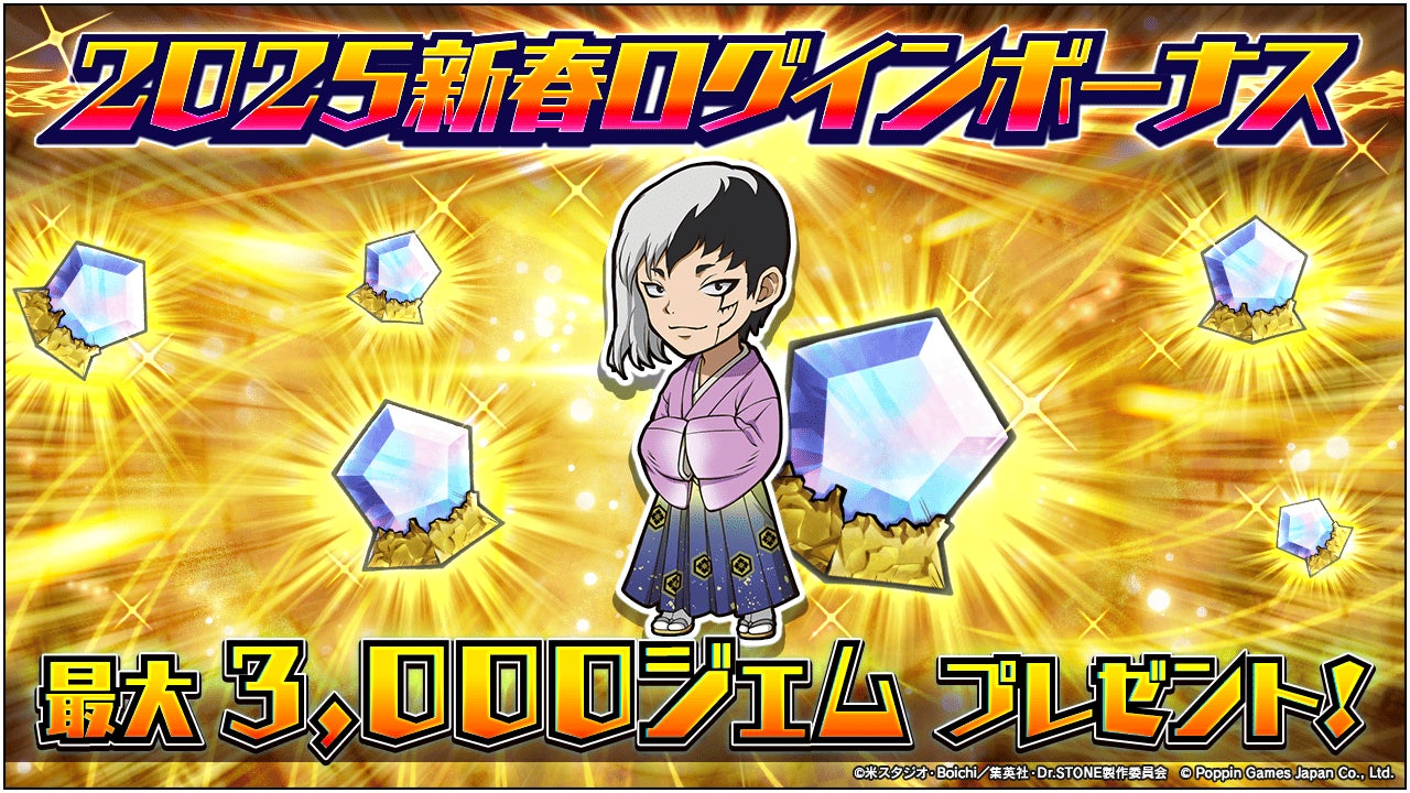 Dr.STONE バトルクラフト 新キャラ登場ガチャ及び最大3,000ジェムが貰える「2025新春ログインボーナス」開催