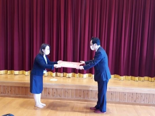 3月25日(金)、熊本県山鹿市立鹿本こども園にて熊本県鹿本地域振興局吉野局長から山口園長への贈呈式及び園児への読み聞かせ会が実施されました。