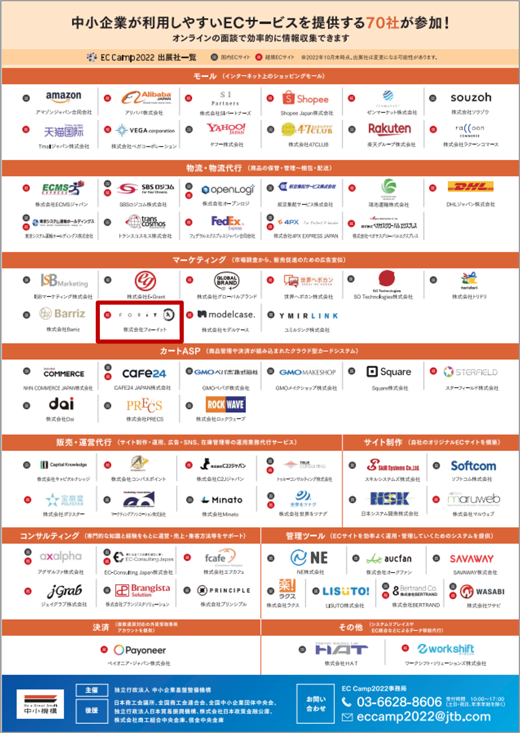 独立行政法人中小企業基盤整備機構(以下、中小機構)のEC活用支援パートナー*¹である株式会社フォーイットは、来る2023/1/25(水)~1/27(金)に開催される「EC Camp2022」へ越境EC支援企業として出展いたします。