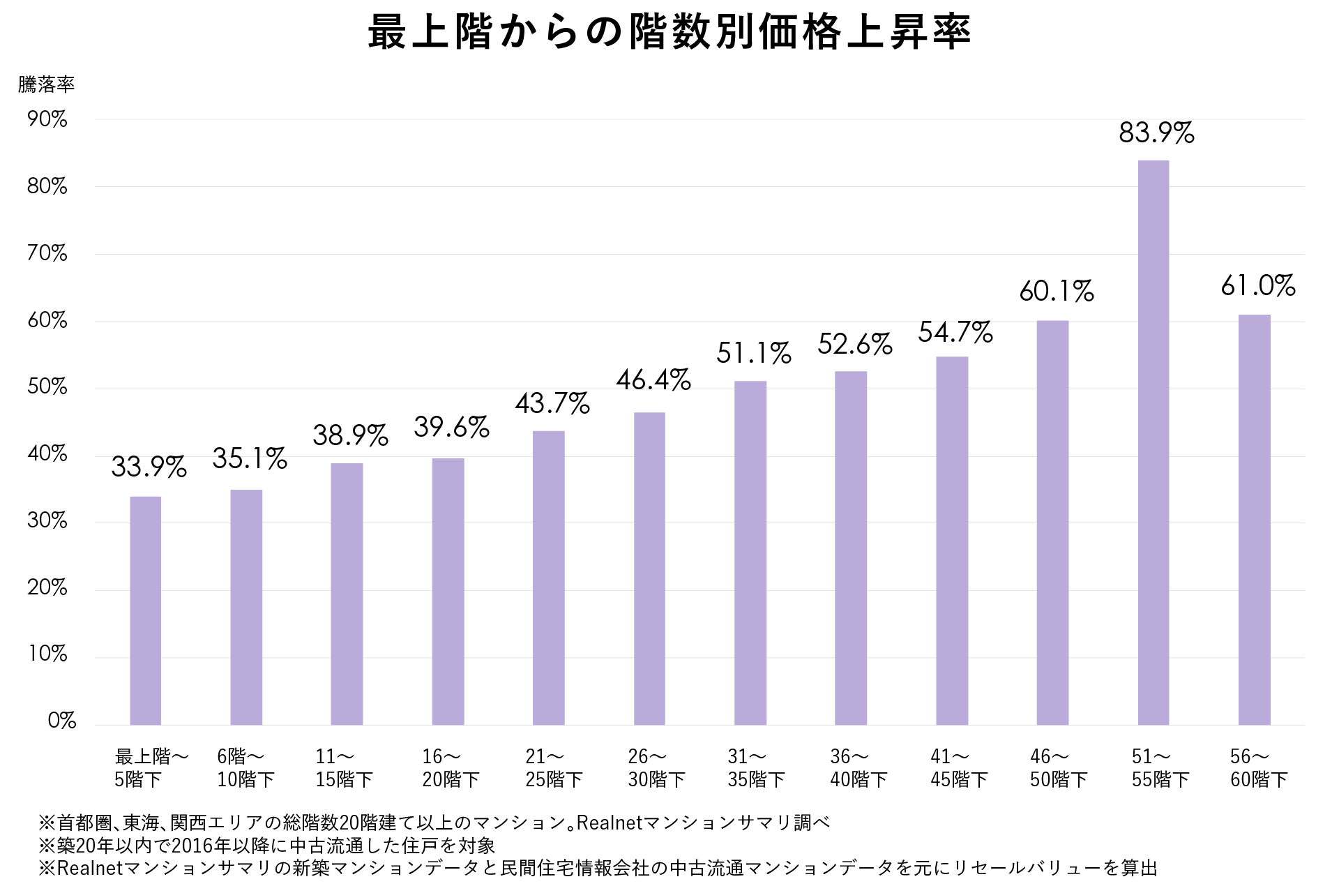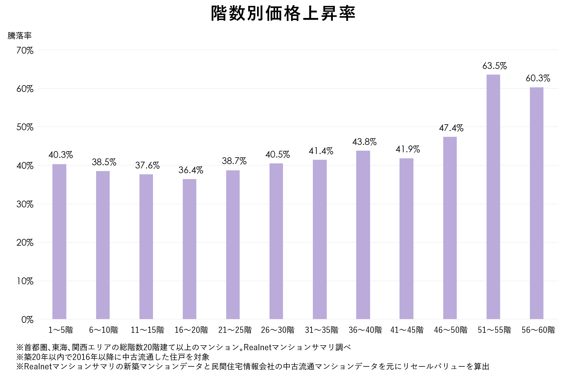 これを見ると、最上階からの階数が多い(低い所在階)程、価格上昇率が高くなっています。特に最上階から45階以上離れた低層階は平均60%以上も上昇していることが分かりました。
