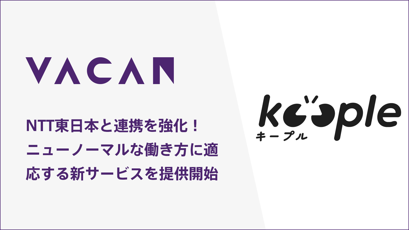 株式会社バカン(本社:東京都千代田区、代表取締役:河野剛進、以下「バカン」)は、東日本電信電話株式会社(本社:東京都新宿区、代表取締役社長:井上福造、以下:NTT東日本)と提携を深化し、ニューノーマルな働き方に適応する共同検討の新サービス、オフィス向けコミュニケーション促進サービス「Keeple(キープル)」の提供を開始します。本提携の一環として同社の本社オフィスの執務スペース約300席にサービスを展開し、テレワークとオフィス勤務のハイブリッド勤務需要に対応した新しいオフィス形態の提案と、従業員の利便性向上を目指すとともに、更なるコミュニケーションの誘発に向けた機能ブラッシュアップを実施していきます。
