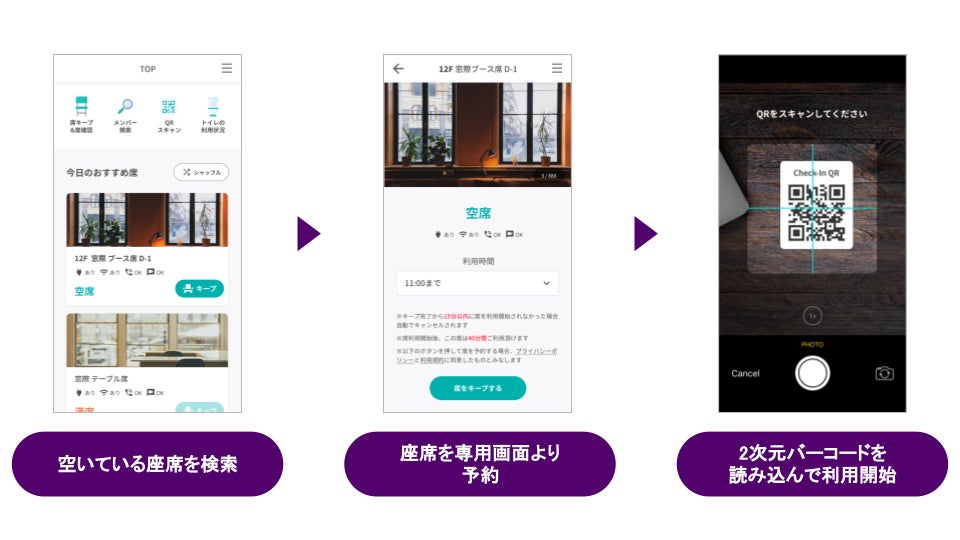 専用サイトにスマートフォンからアクセスすることで、手軽にオフィス内の空いている座席を検索・予約できます。座席を予約した方は座席に設置されているQRコードやタブレットのバーコードを読み取ることで、簡単にチェックインが可能となります。
