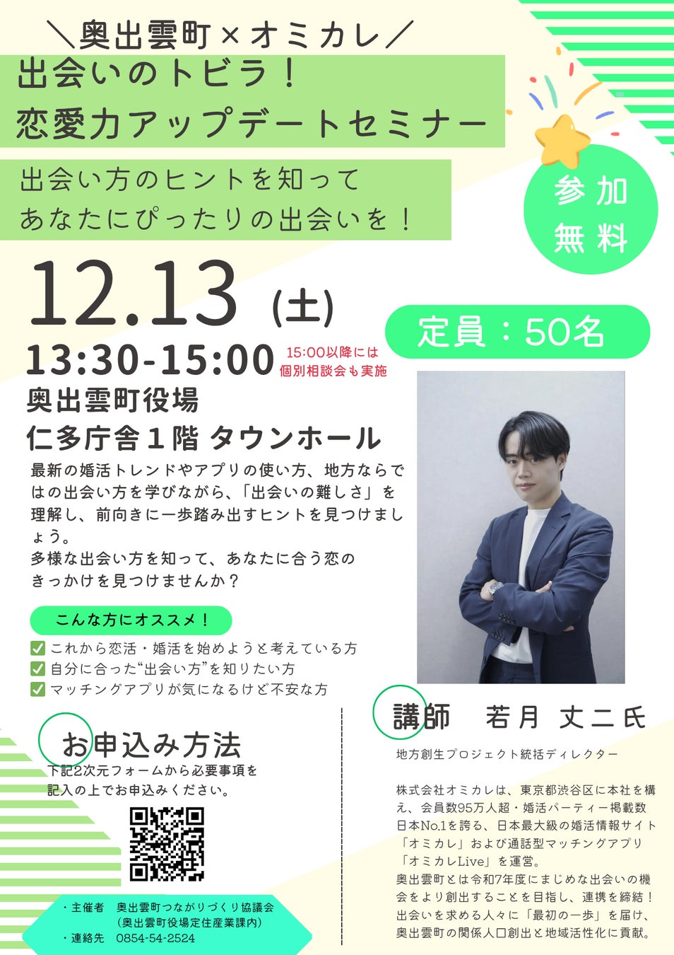 会員数95万人超、「今月行ける婚活パーティー・街コン」掲載数日本No.1※を誇る日本最大級の婚活情報サイト「オミカレ」運営や、全国各地の自治体における恋活支援を行う株式会社オミカレ(本社:東京都渋谷区、代表取締役社長:久留宮 雅仁、以下「オミカレ」)は、2025年12月13日(土)、島根県奥出雲町役場にて、参加無料の「出会いのトビラ!恋愛力アップデートセミナー ~出会い方のヒントを知って、あなたにぴったりの出会いを!~」を開催します。