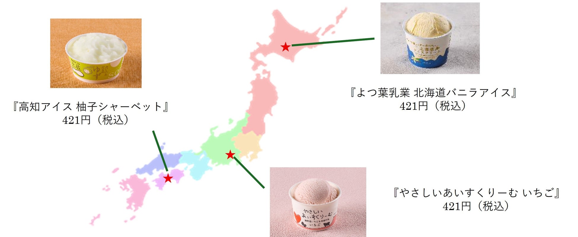 本フェアでは、北海道の『よつ葉乳業 北海道バニラアイス』、静岡県の『やさしいあいすくりーむ いちご』、高知県の『高知アイス 柚子シャーベット』の計3商品を販売いたします。