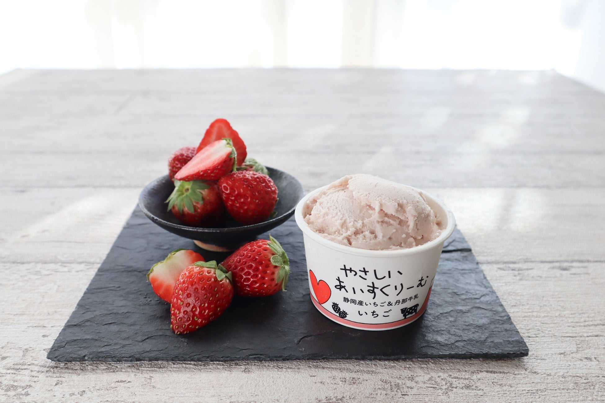 静岡県の牛乳と、県産いちごをたっぷり使用した、こだわりのいちごアイス。安定剤・乳化剤・着色料・香料を使用しておらず、いちご本来の甘酸っぱさと自然な色合いを活かした、爽やかで優しい口当たりで、