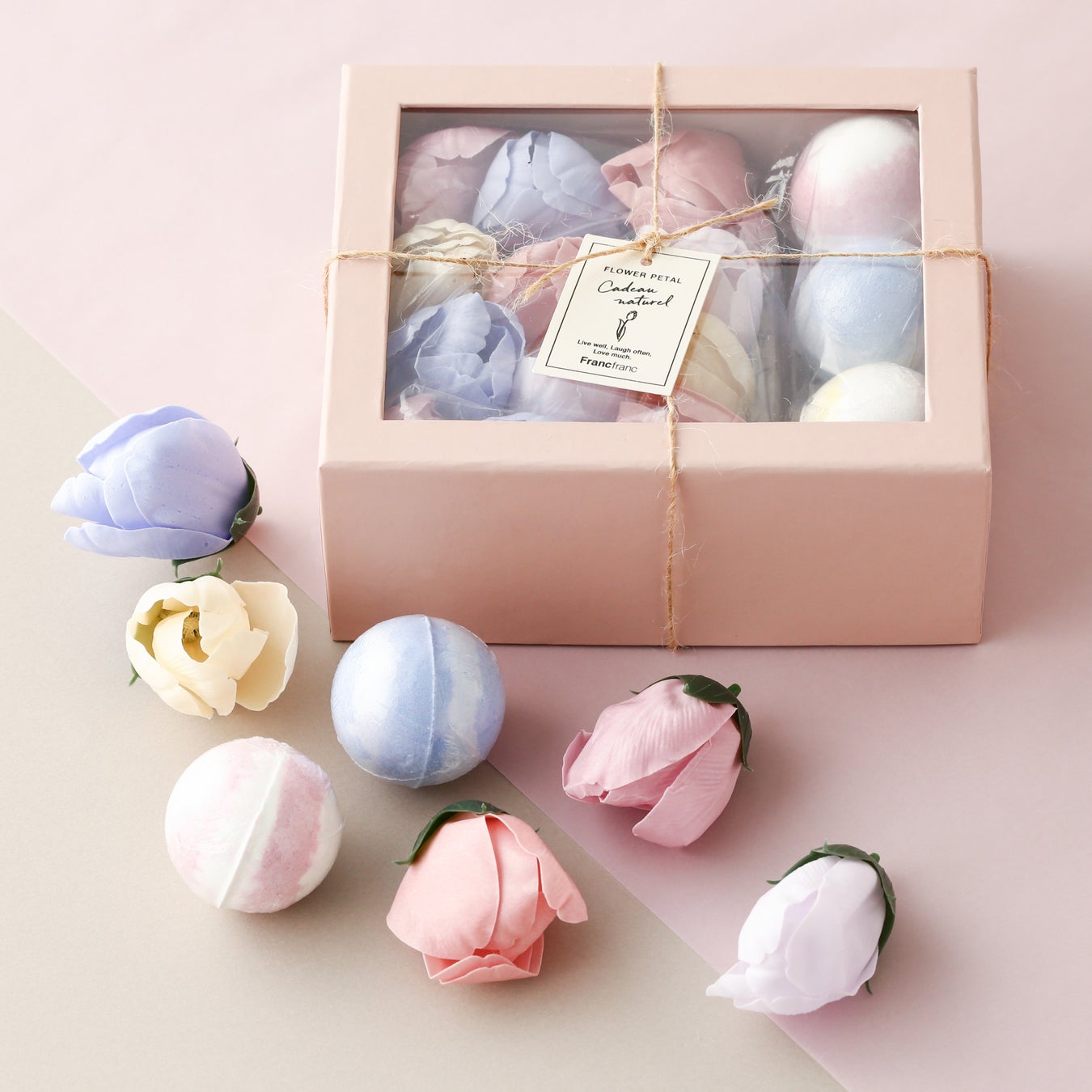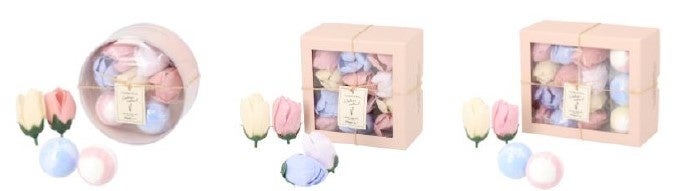 チューリップのブーケをイメージした入浴剤のシリーズです。チューリップモチーフのペタルとかわいいマーブル模様のフィズを落ち着きのあるマルチカラーでまとめた春のギフトにぴったりのアイテムです。