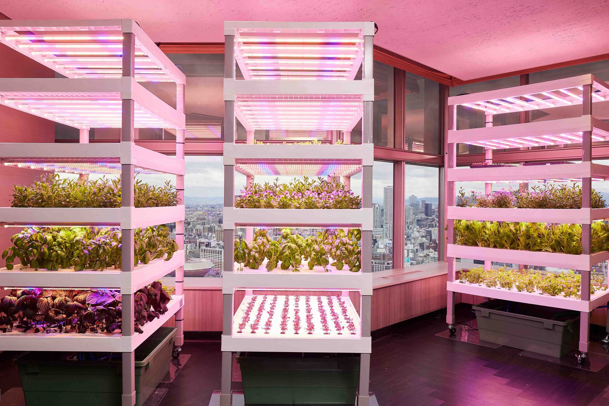 ホテル最上階のレストラン「テーブル36」のエントランスに設置した水耕栽培モジュール「The Sky Farm」。このThe Sky Farmで育った農薬不使用の新鮮で安全な野菜やハーブ類は、収穫後ホテル内レストランにて提供しております。地域社会への貢献として、この取り組みにより農作物の輸送が不要となることによる二酸化炭素排出量の削減、生態系に影響を与える農薬の排除、立体装置での栽培による農地面積の削減、収穫頻度の向上など様々な効果が期待できます。