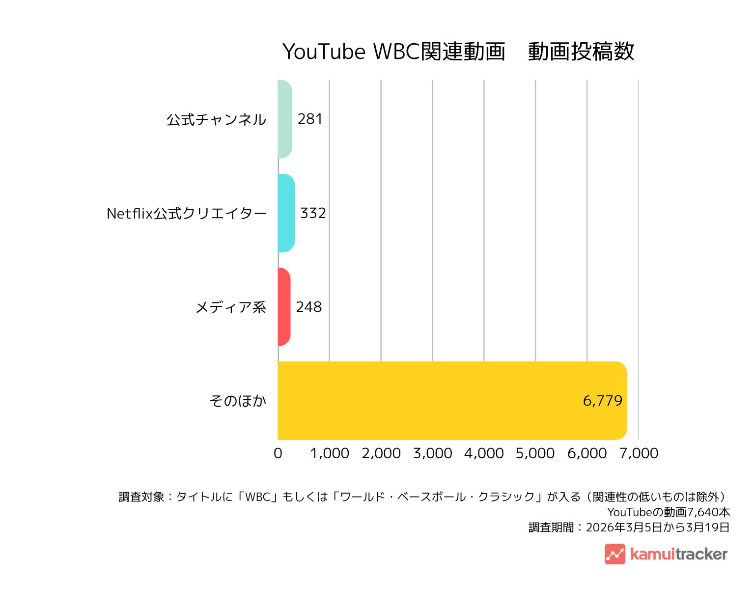今回の分析では、2026年3月5日から3月19日までに観測されたWBC関連動画のうち、ゲーム系や便乗ハッシュタグなど直接関係の薄い動画を除外した7,640本を対象としました。なお、メディア系は放送局・大手報道機関・主要スポーツメディアの公式アカウントに限定し、Netflix公式クリエイターは公開されていた公式クリエイターの一覧を基準に分類しています。