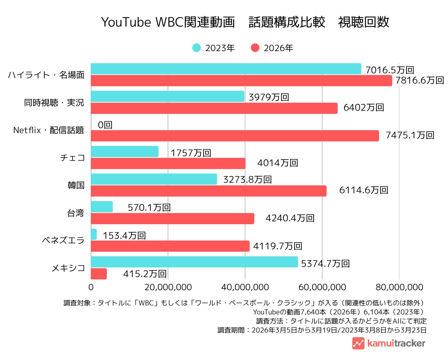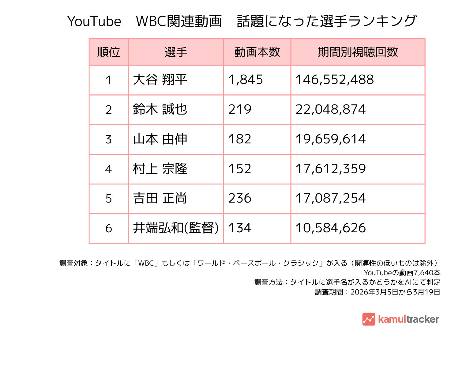 株式会社エビリー(本社:東京都渋谷区、代表取締役社長:中川恵介、以下エビリー)は、当社が提供するYouTubeデータ分析ツール『kamui tracker(カムイトラッカー)』を用い、2026年3月に開催されたワールド・ベースボール・クラシック(以下、WBC)について、YouTube上の関連動画動向を分析しました。