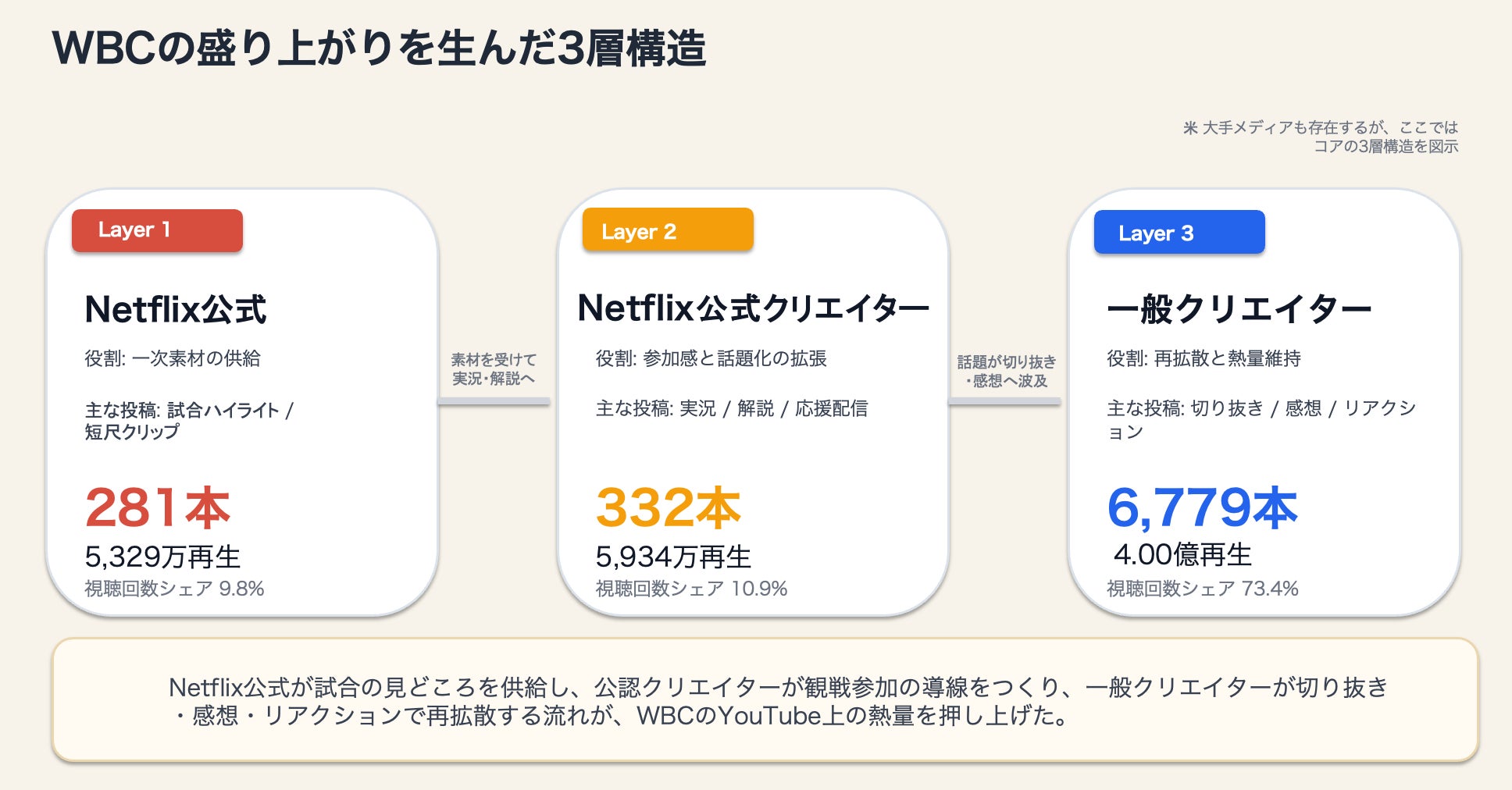 今回の分析から、2026年WBCのYouTube上での盛り上がりは、Netflix Japan公式チャンネル、Netflix公式クリエイター、一般クリエイターの3層が連動することで大きく拡張したと考えられます。まずNetflix Japan公式チャンネルが試合ハイライトや短尺クリップといった一次素材を供給し、その素材や試合展開を受けてNetflix公式クリエイターが実況、解説、応援配信で参加感を広げ、さらに一般クリエイターによる切り抜き、感想、リアクションへと波及しました。単発の公式発信で終わらず、視聴者との距離が異なる複数の投稿主体を経由して熱量が広がったことが、今大会のYouTube拡散の大きな特徴です。