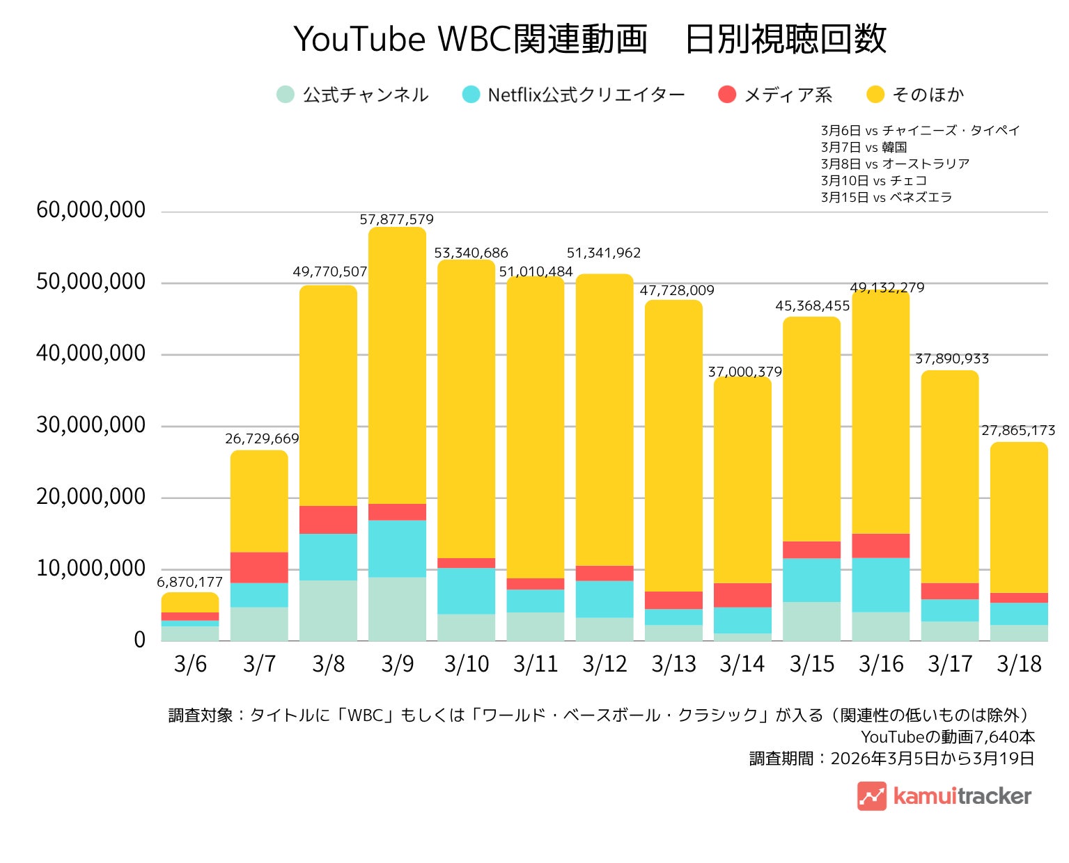 全体ピークは 3月9日の5,787万回でした。また、準々決勝翌日の3月16日は 4,913万回 となり、3月15日準々決勝当日の4,536万回を上回りました。日本戦の熱量が試合当日で終わらず、翌日のハイライト視聴、解説、感想動画の消費にまで波及したことがうかがえます。