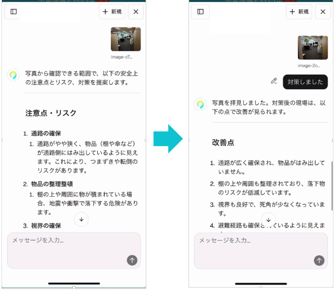 現場写真を送信するだけで、AIが危険箇所や注視すべきポイントを自動で指摘します。KY(危険予知)会議の準備を効率化し、日々の安全確認を迅速かつ確実に実施できます。