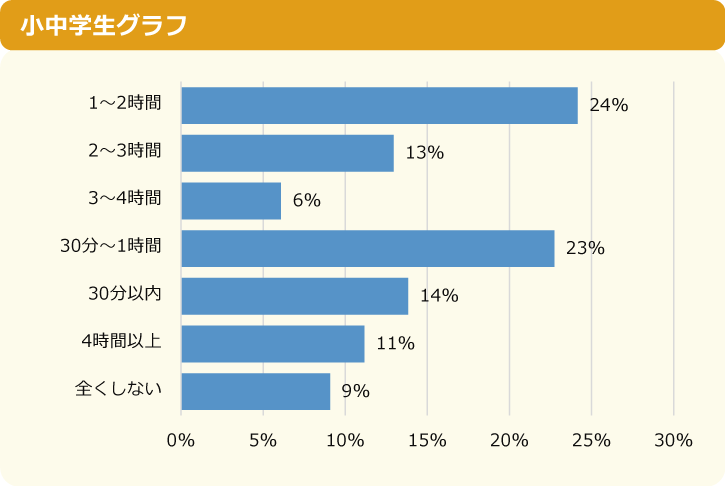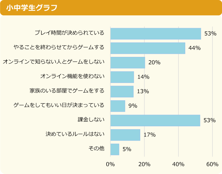 1日のゲーム時間は「1~2時間」と回答した小中学生が最も多く、全体のおよそ6割が2時間以内の範囲でゲームを楽しんでいるようです。一方、「ゲームについて、おうちの人と決めているルールはある?」の設問結果では、小中学生の53%が回答した「プレイ時間が決められている」と「課金しない」が同率1位となりました。