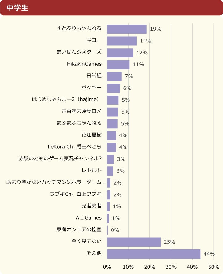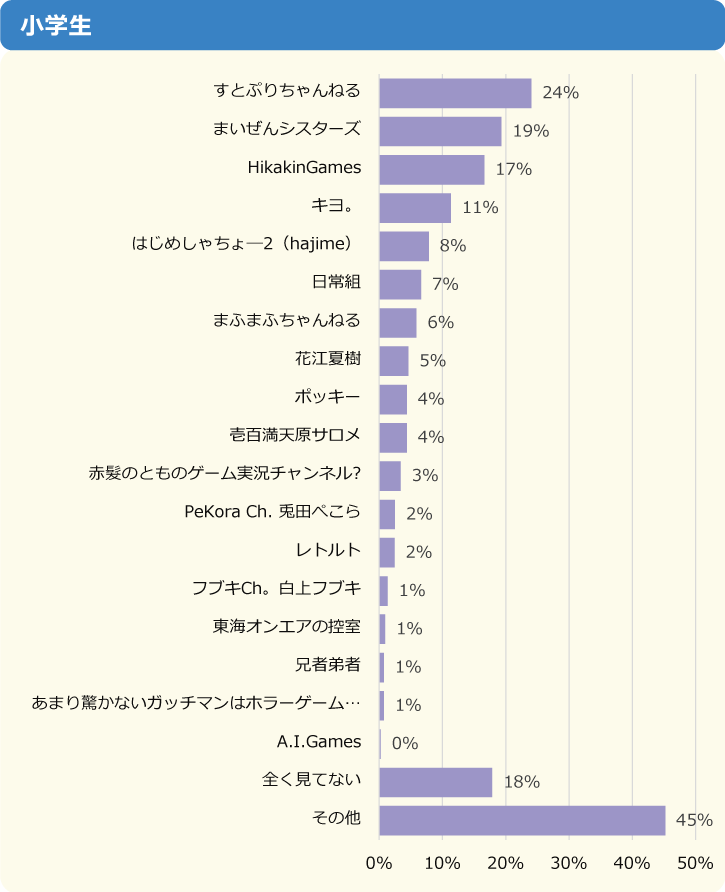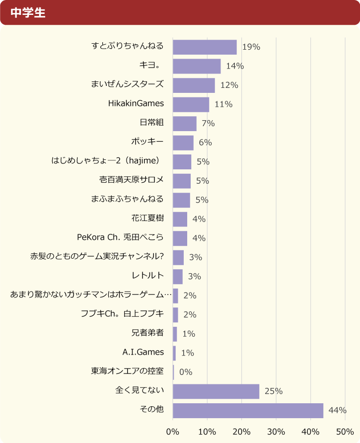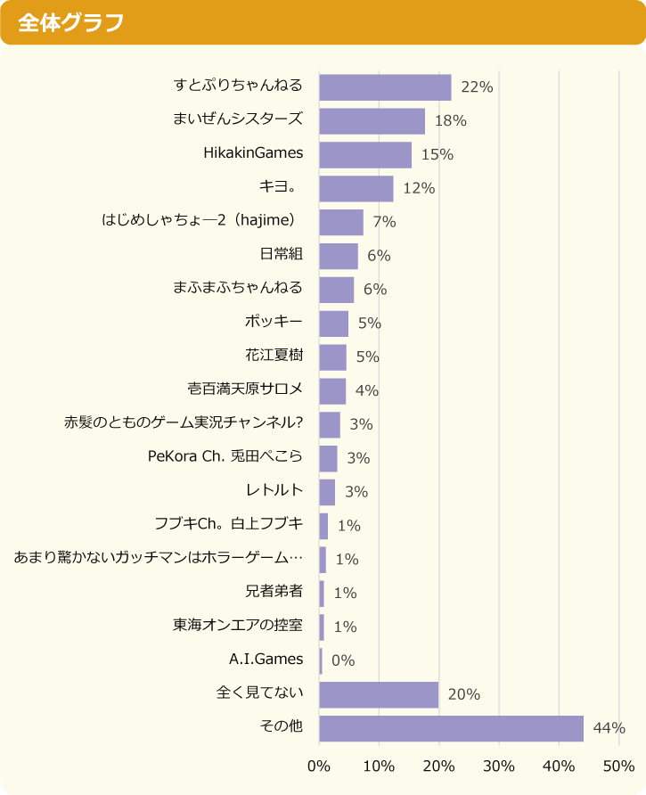 他にも「日常組」や「ポッキー」、「はじめしゃちょー2 (hajime)」、「壱百満天原サロメ」などの名前が上がりました。その一方で、全体の20%が「ゲーム実況チャンネルを全く見てない」と回答しました。