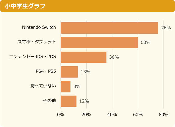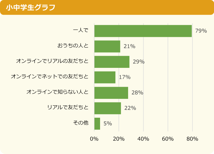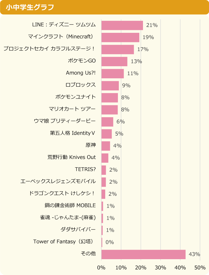 他にも「やることを終わらせてからゲームする」が44%、「オンラインで知らない人とゲームをしない」が20%など、各家庭でさまざまなルールが設けられていますが、小中学生の17%がルールなしでゲームを楽しんでおり、「決めているルールはない」と回答する人も少なくないようです。