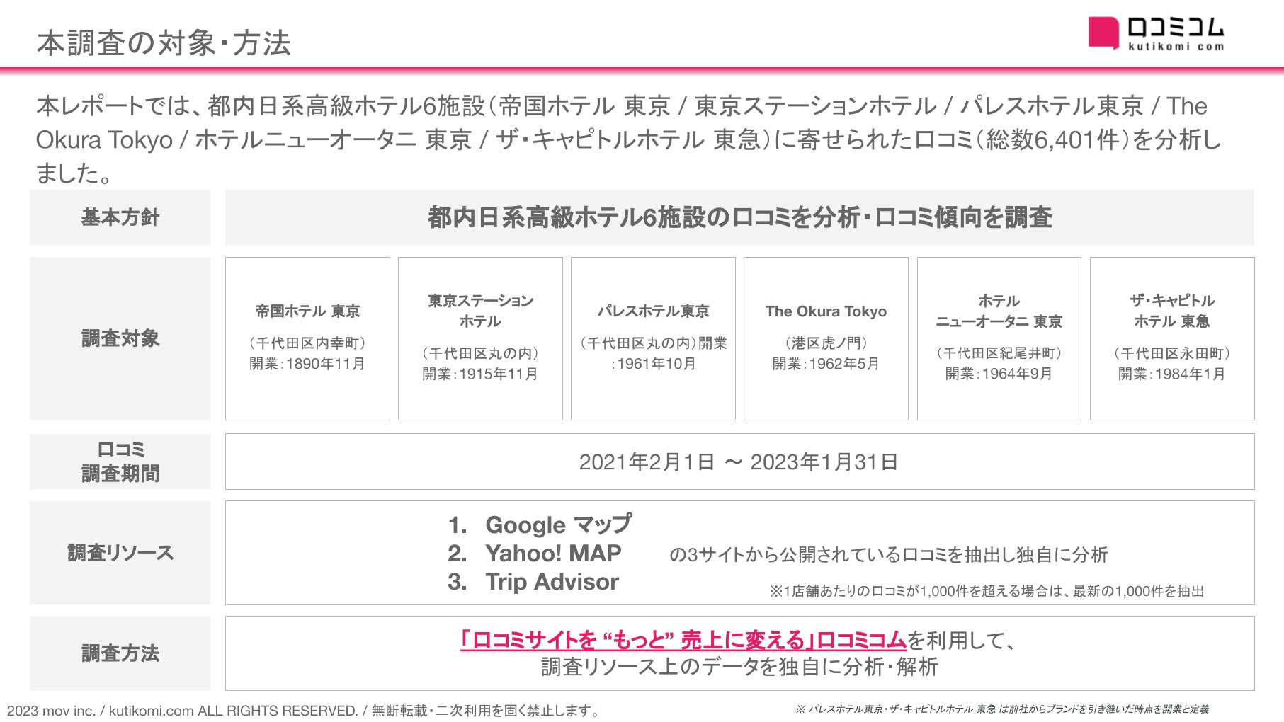 今回は、都内老舗高級ホテル6施設に寄せられた約6,400件の口コミを調査し、業界の傾向や施設間の比較検証を行いました。