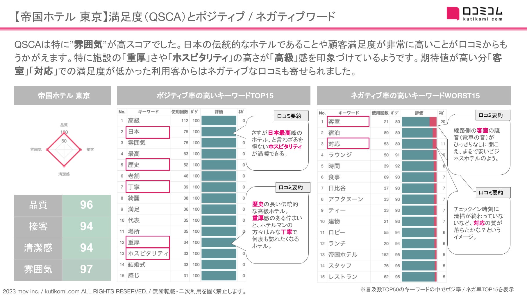 今回は、このAI解析を用いて【帝国ホテル 東京 】のQSCA・ポジ / ネガキーワードを確認しました。
