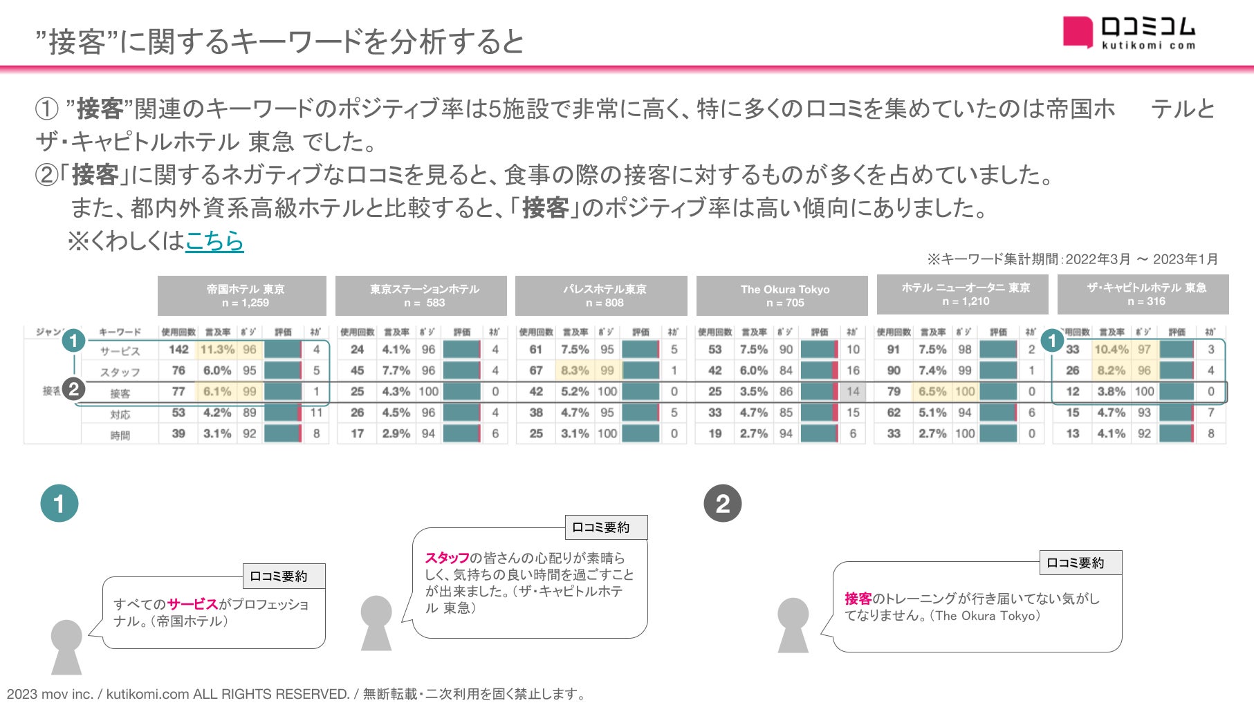① ”接客 ”関連のキーワードのポジティブ率は5施設で非常に高く 、特に多くの口コミを集めていたのは帝国ホテル とザ・キャピトルホテル 東急でした。