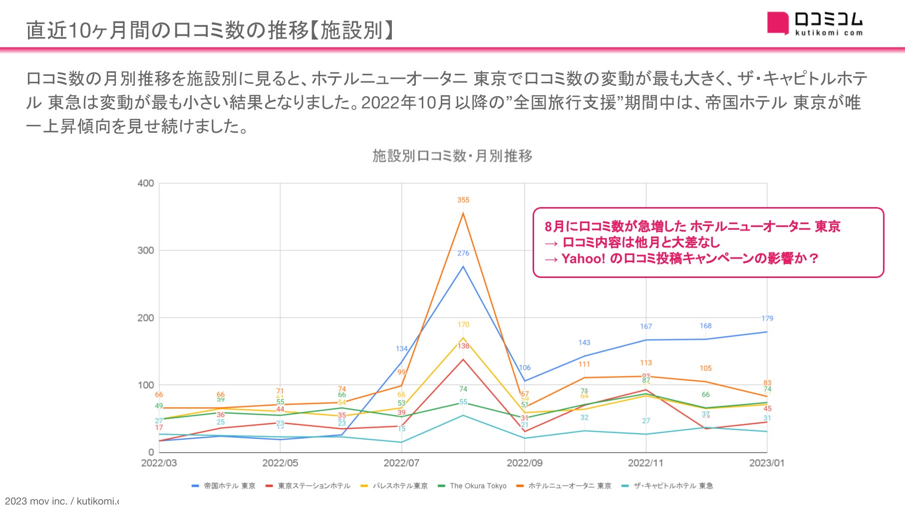 口コミ数の月別推移を施設別に見ると、ホテルニューオータニ 東京で口コミ数の変動が最も大きく、ザ・キャピトルホテル 東急は変動が最も小さい結果となりました。2022年10月以降の”全国旅行支援”期間中は、帝国ホテル 東京が唯一上昇傾向を見せ続けました 。