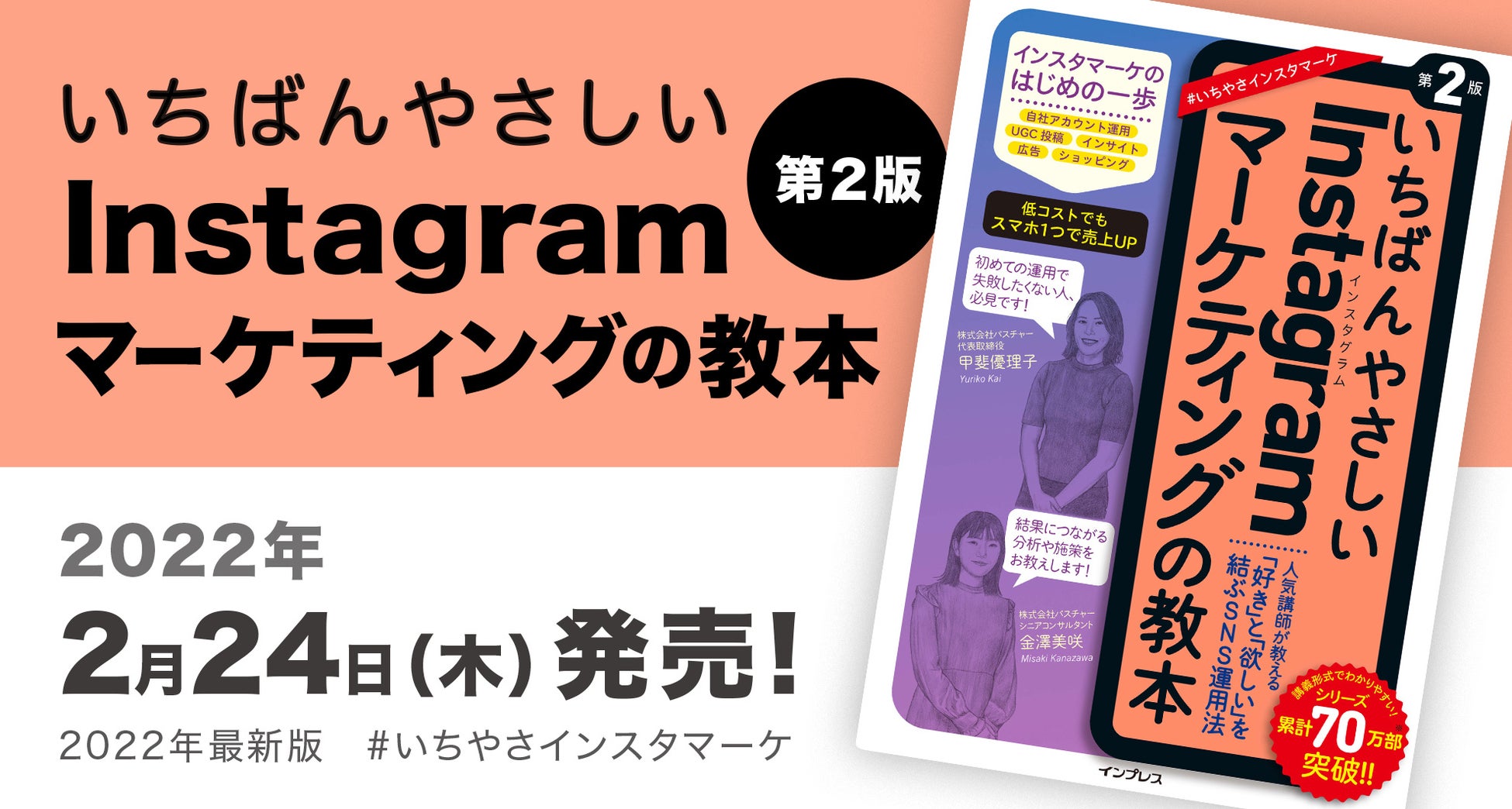 Instagramを中心にSNSマーケティング支援を行う株式会社パスチャー(本社:東京都渋谷区、代表取締役:甲斐 優理子、以下当社)は、当社代表取締役の甲斐 優理子およびシニアコンサルタントの金澤 美咲の2名が執筆に携わりました『いちばんやさしいInstagramマーケティングの教本 第2版』が、2022年2月24日(木)より発売されることをお知らせいたします。