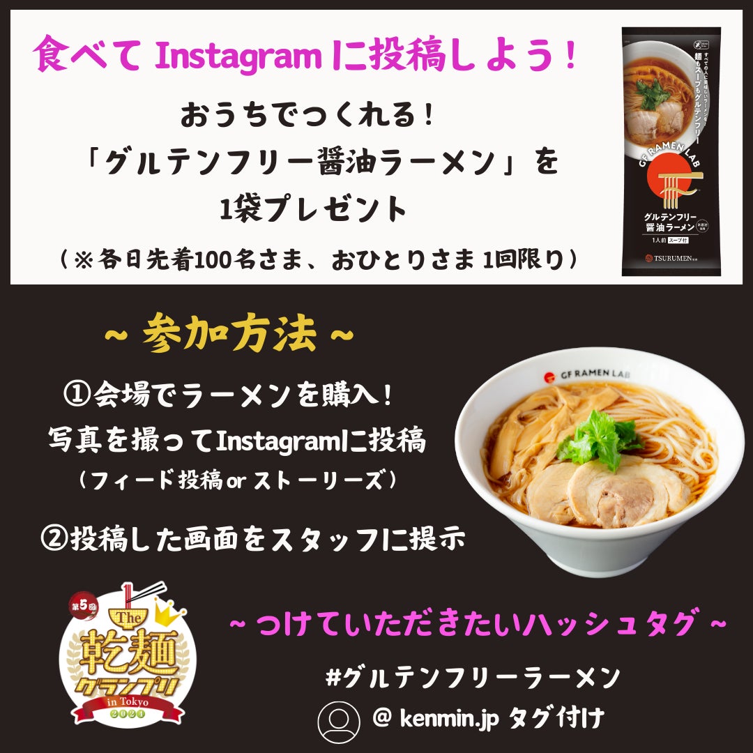 投稿する際は、@kenmin.jpをタグ付けし、#グルテンフリーラーメン をつけていただくようにしてください。