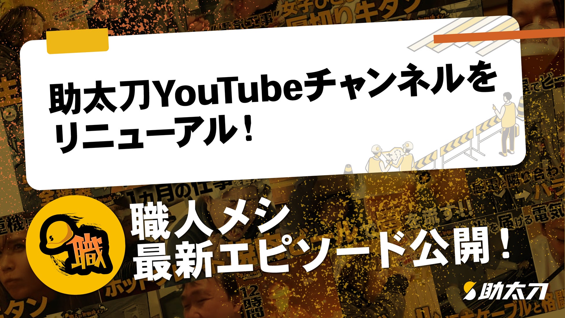 22万超の登録事業者が利用する国内最大級の建設人材マッチングプラットフォームを運営する株式会社助太刀(以下、当社)は、建設業界の多面的な魅力を発信するため、複数に分かれていた公式YouTubeチャンネルを統合しリニューアルいたしました。また、人気シリーズである「職人の労働後メシ」を再始動し、2025年10月3日に最新エピソードを公開しました。