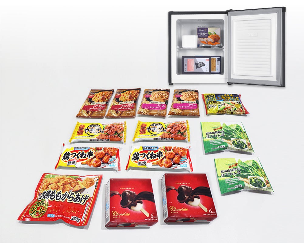 小さい見た目ながら容量は33Lもあり、写真のように大量の冷凍食品を入れることができます。業務用サイズの冷凍食品や今話題のサブスクの冷凍食品、ふるさと納税の返礼品、特売日にたっぷりとまとめ買いしてしまった食品をストックする、専用冷凍庫として活躍いたします。