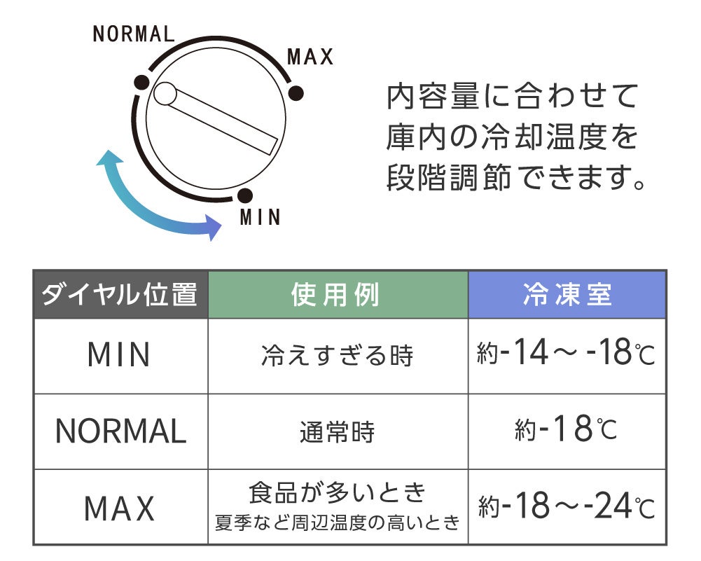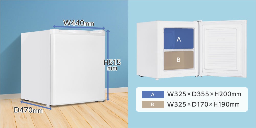 約50cm四方(幅44×奥行47×高さ51.5cm)のコンパクトな本体は、キッチンだけでなく作業部屋等のちょっとした空間に置くことができる、セカンド冷凍庫として使いやすいサイズ感です。