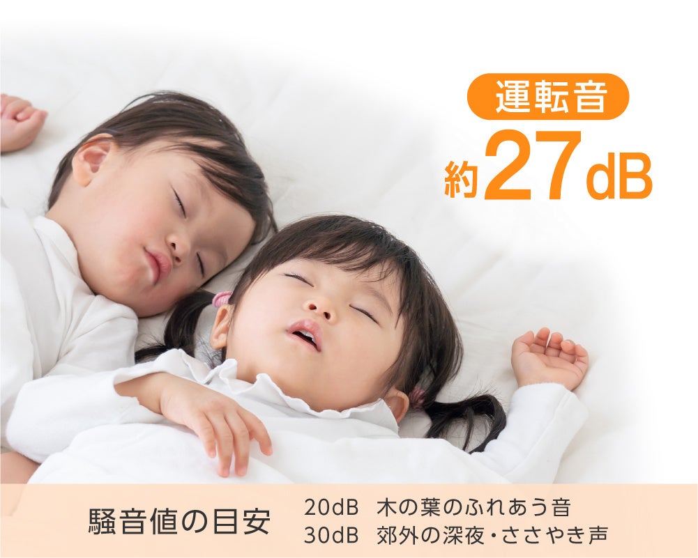 運転音はわずか27dBほどで静かなため、赤ちゃんがいるご家庭のリビングや寝室に設置しても日常生活に差し支えなくお使いいただけます。