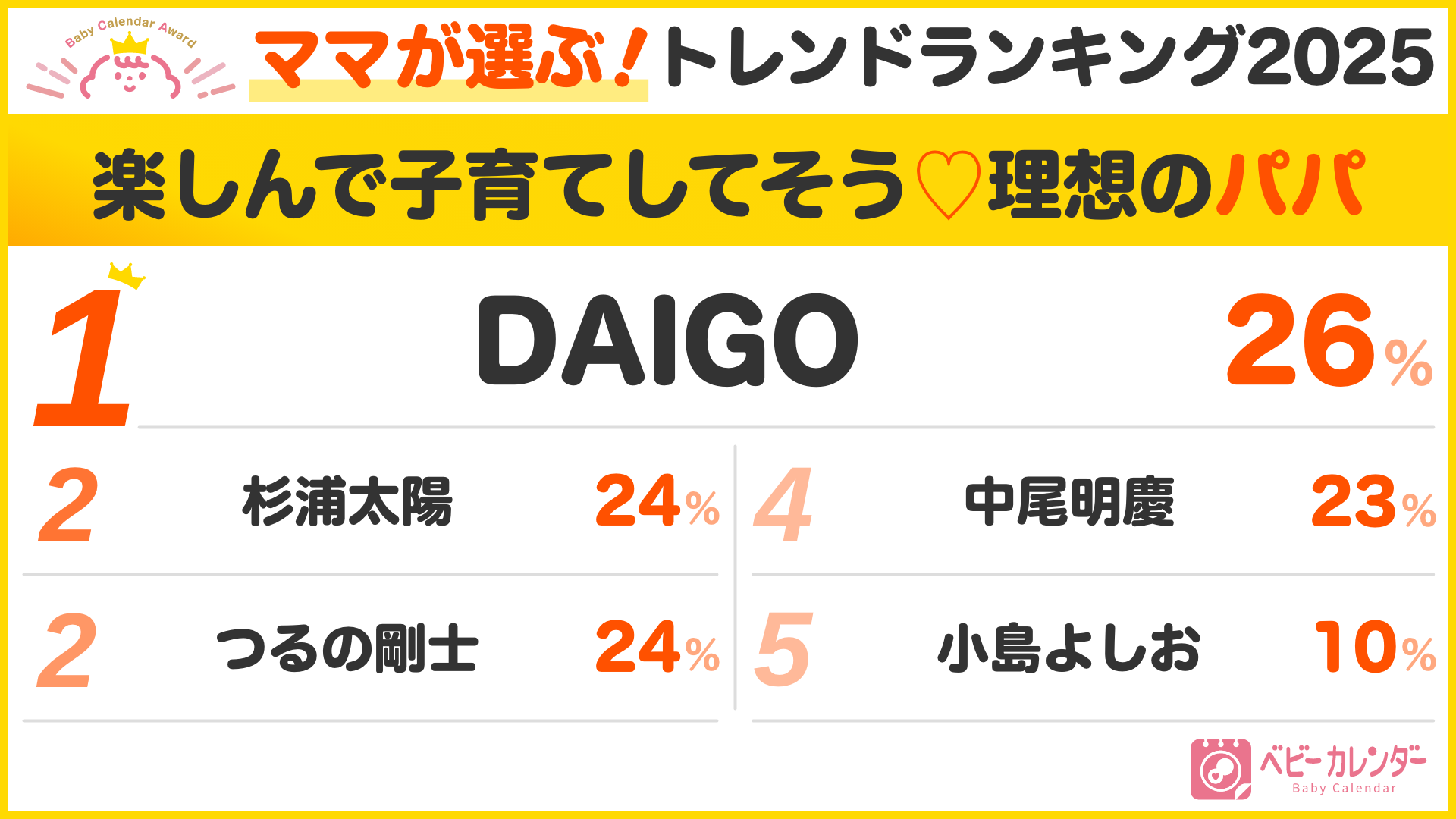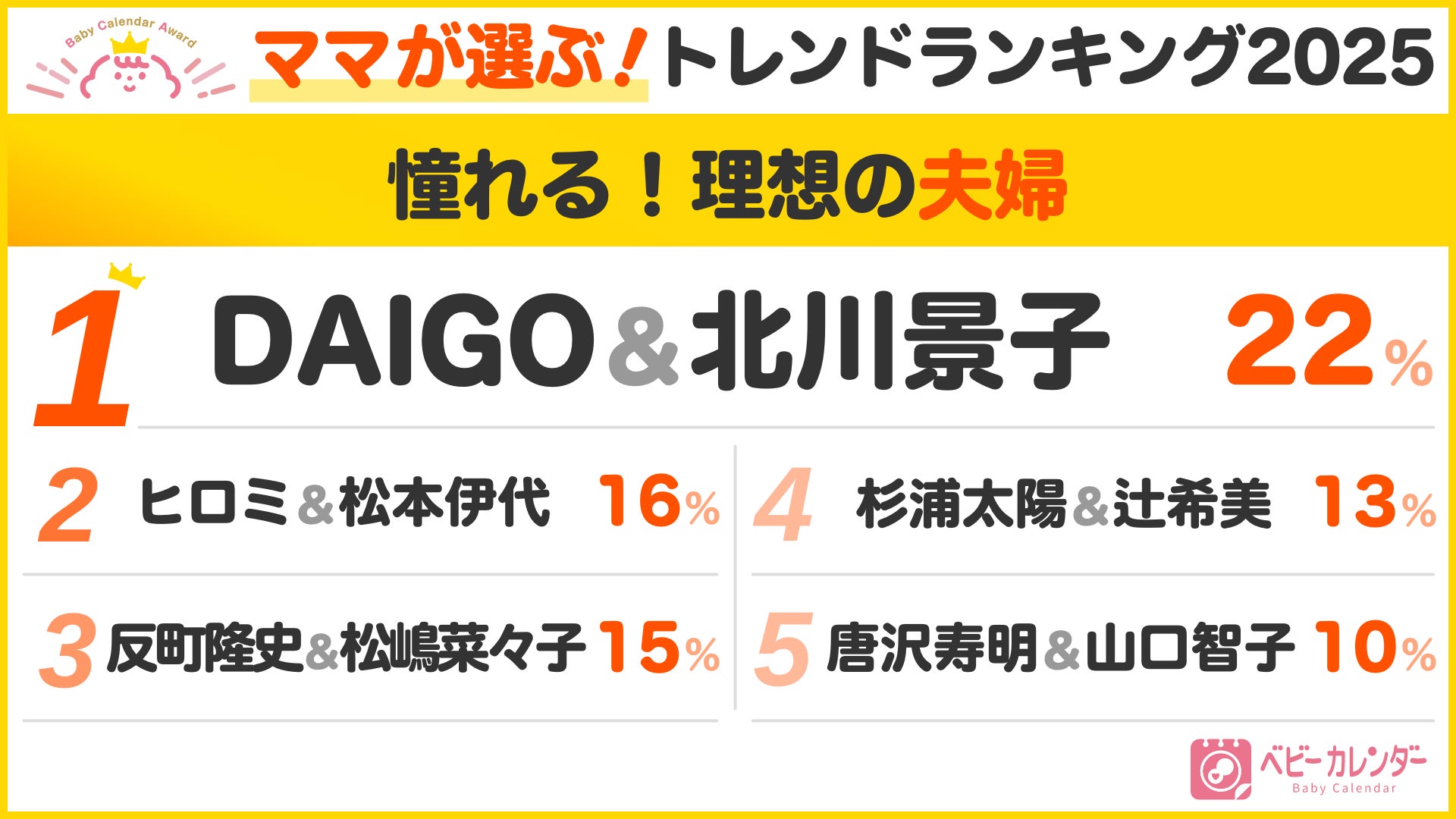 理想の夫婦は2年連続でDAIGO&北川景子。理想のパパ・義父母に選ばれたのは…あの有名人!!ママ注目のYouTubeやサブスクなど気になるランキングが盛りだくさん。5年連続1位に輝く育児グッズも必見!