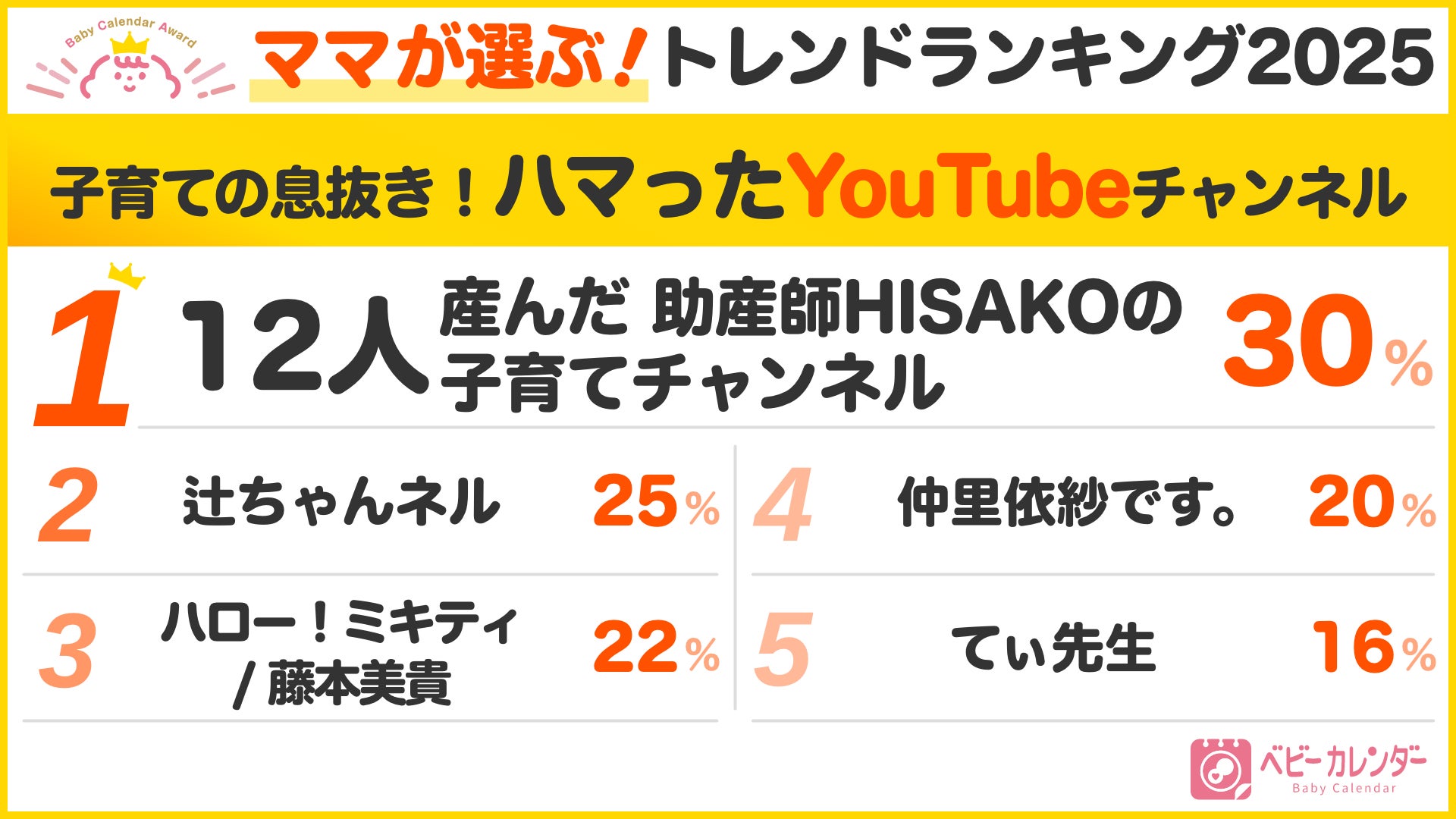 前回2位の「【12人産んだ】助産師HISAKOの子育てチャンネル」が今回1位に。人には話しづらい女性の悩みや出産・子育てについて幅広く発信しており、多くのママから支持を集めました。初ランクインとなったのは藤本美貴さんの「ハロー!ミキティ / 藤本美貴」と保育士・てぃ先生のチャンネル。おふたりの発言に気づきをもらえる、と子育ての参考にしているママも多いようです。