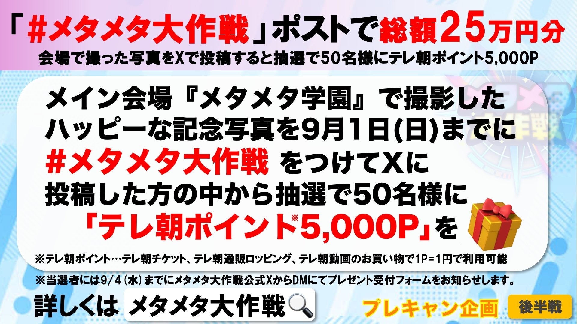※当選者には9月4日(水)までにメタメタ大作戦公式XからDMにて当選者用プレゼント受付フォームをお知らせします。9月11日(水)までに受付が完了した方に「テレ朝ポイント(期間限定P)5,000P」をプレゼントします。期間限定Pはテレ朝チケット、テレ朝通販ロッピング、テレ朝動画のお買い物で1P=1円でご利用いただけます。