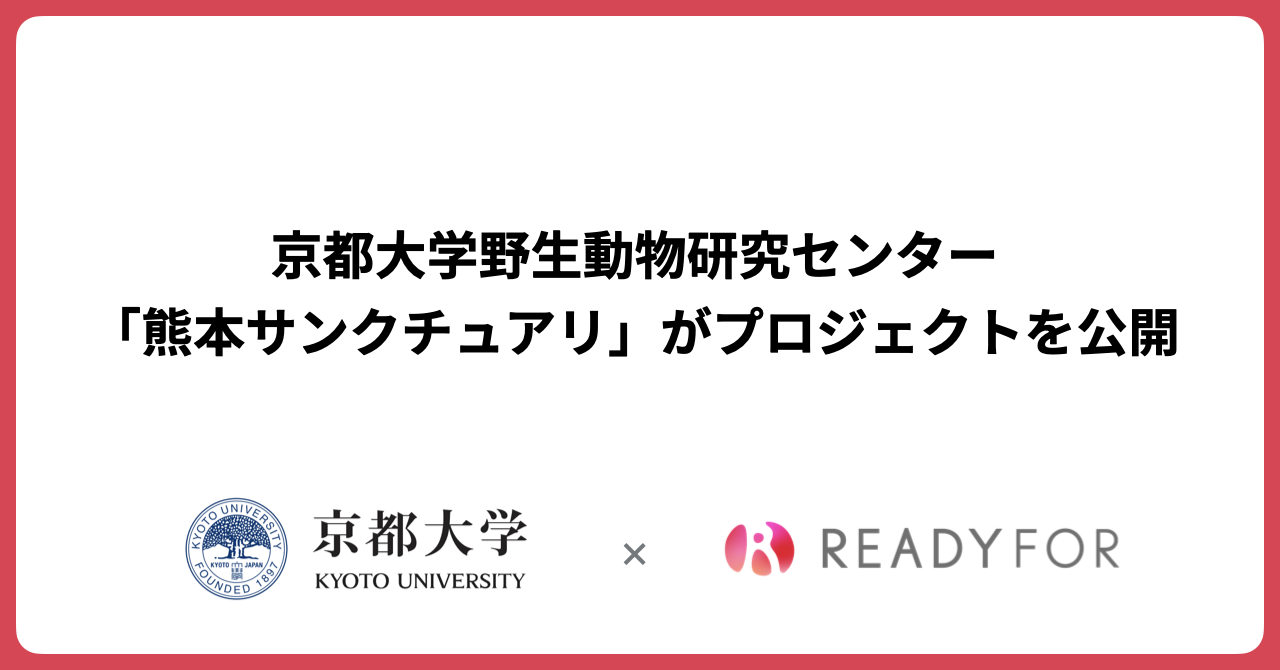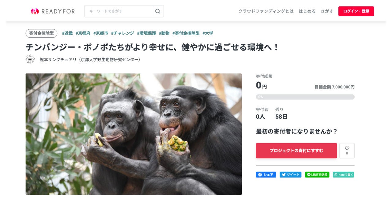 クラウドファンディングサービス「READYFOR」にて京都大学野生動物研究センター「熊本サンクチュアリ」が700万円を目標にプロジェクトを公開
