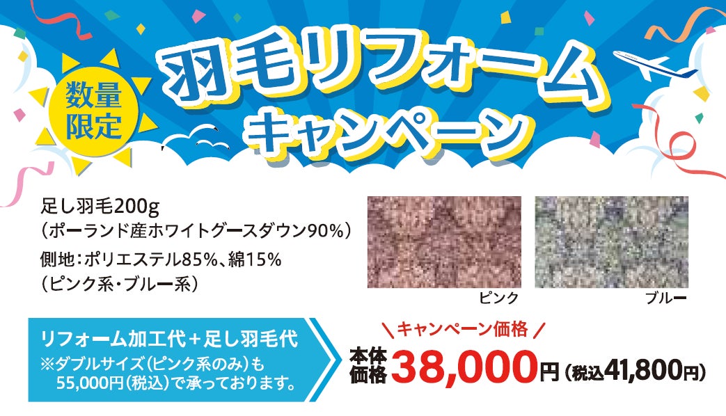 夏が近づくこの季節は、使わなくなる羽毛ふとんをしまう前に、プロの手でふっくら新品のように回復させる絶好のタイミングです。昭和西川株式会社(所在地:東京都中央区、代表:西川惠)は、7月2日(水)~15日(火)の期間中、まるひろ川越店5階にて期間限定で「羽毛ふとんリフォームフェア」を開催いたします。期間中は、数量限定の特別価格に加えて、お得なプランもご用意しています。この機会をどうぞお見逃しなく。