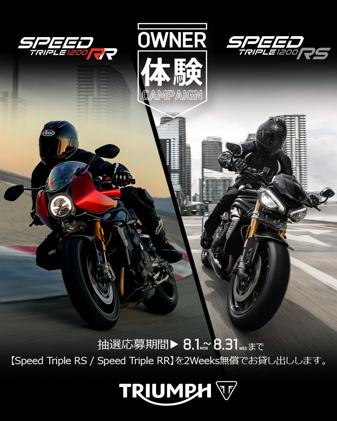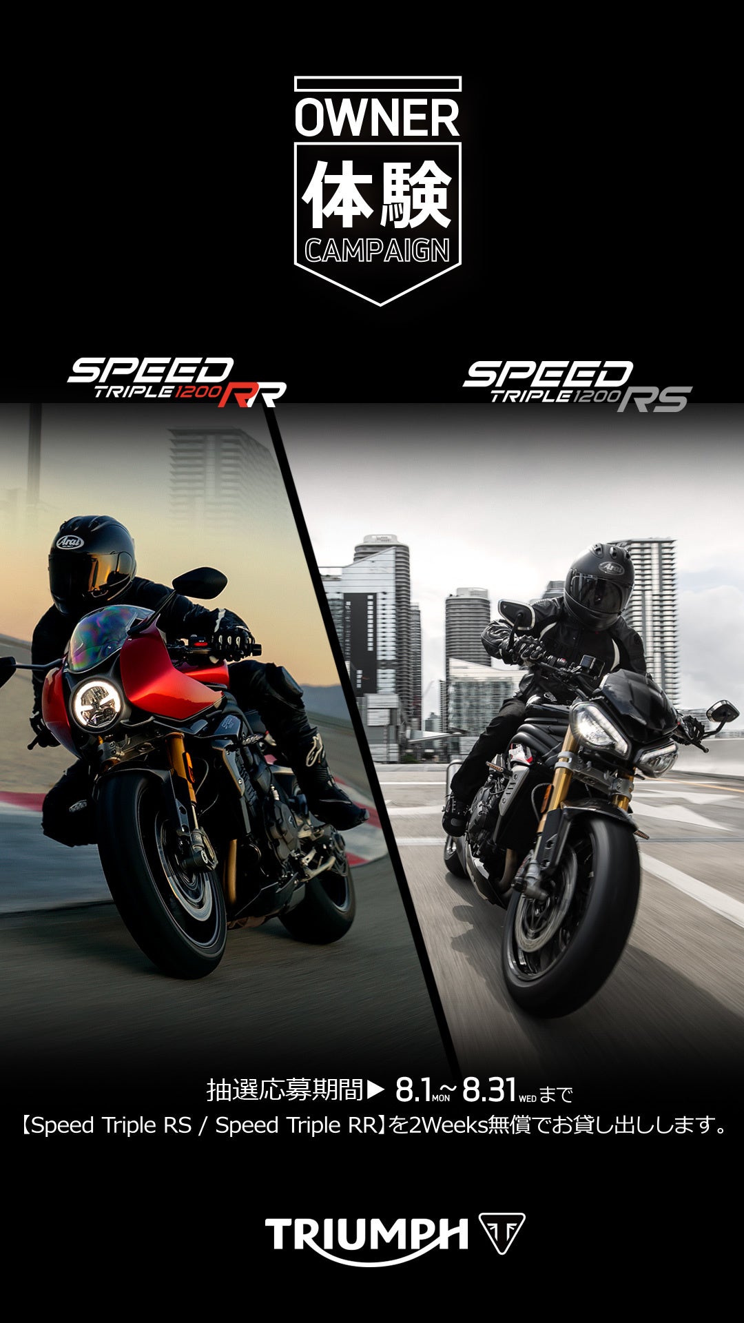 今回このSpeed Triple 1200 RS、Speed Triple 1200 RR、それぞれ1台を抽選で1名様(合計2名)に、「Owner体験」として9/12以降の2週間、ご当選者にお貸出します(お引き渡し日は、ご当選者の希望日と、引き渡しご希望先の正規販売店と調整のうえ決定します)。