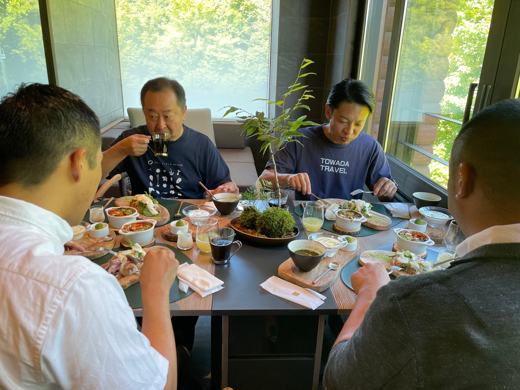 10年間ともに奥入瀬渓流の観光を支えてきた事業者に、2023年に登場したばかりのラグジュアリーな客室「苔スイートルーム」をお披露目しました。苔スイートルームは、至るところに苔のデザインを施した、苔に包まれる贅沢感とくつろぎを感じられる、こだわりの客室です。続いて、苔スイートルーム宿泊者限定の特別朝食「苔モーニング」の試食会を実施しました。参加した事業者の方々は、さまざまな目線で、苔を通した新たなコンテンツの可能性を探っていました。