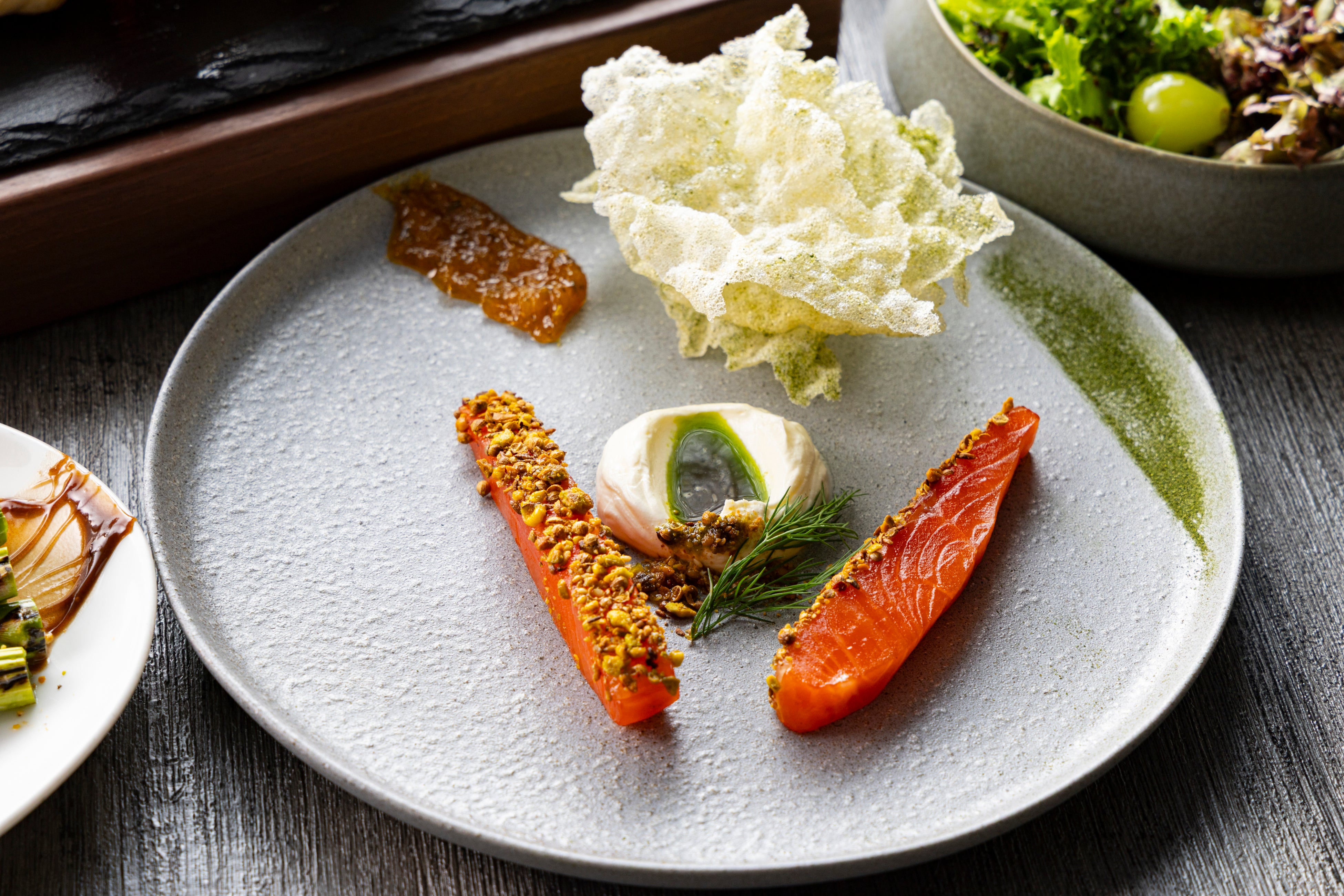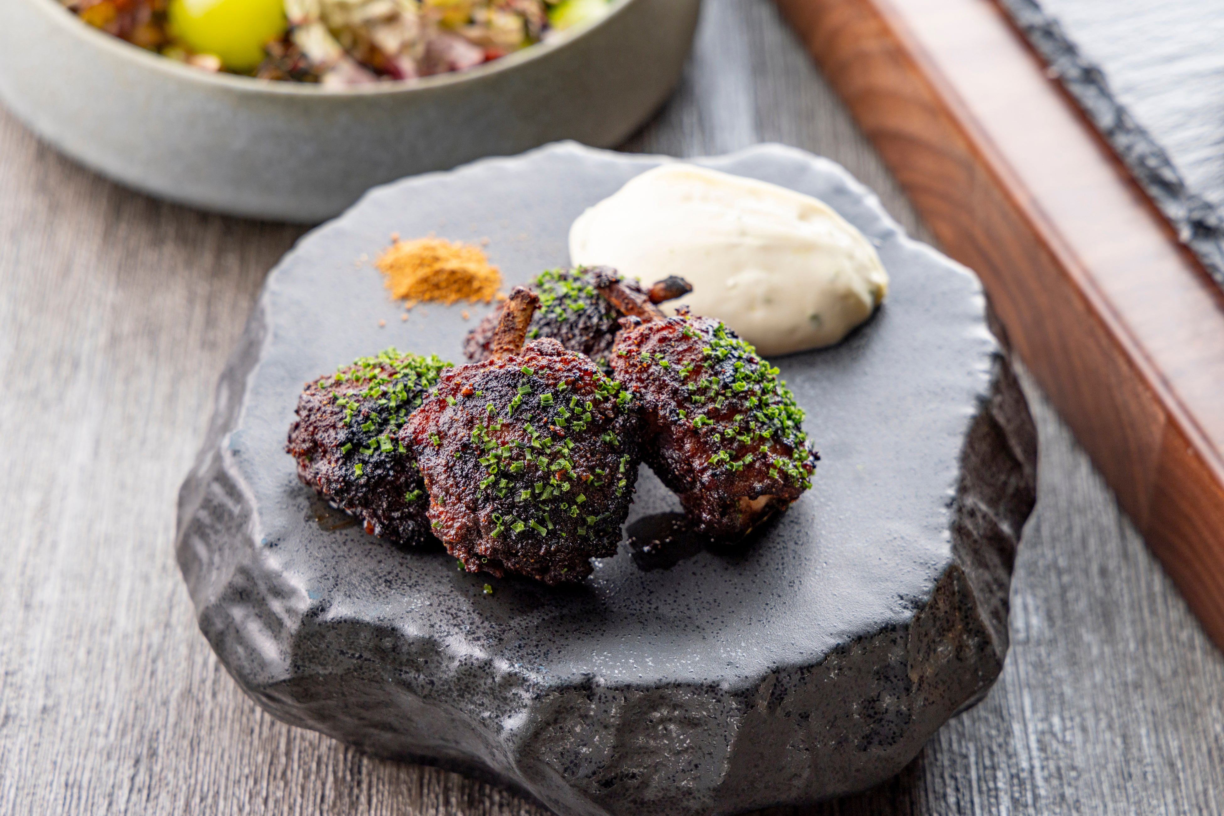 トマホークは、厳選した国産牛を和牛の脂で丁寧にコーティングし、28日間かけてじっくり熟成。牛脂の芳醇な旨味が肉全体に行き渡り、しっとり柔らかな肉質へと導きます。約2㎏のトマホークはお客様の目の前の大型グリルカウンターでダイナミックに焼き上げていきます。桜の薪を用い、約1時間かけて火入れすることで、上質なスモーク香が肉のお美味しさをより深めます。ソースは「チミチュリ」、「赤ワイン」、「ポン酢」の3種類に加え、肉本来の美味しさを引き立てるヒマラヤ岩塩をご用意。焼き上がったトマホークはシェフがテーブルまで運び、ゲストの目の前で切り分けてサーブします。