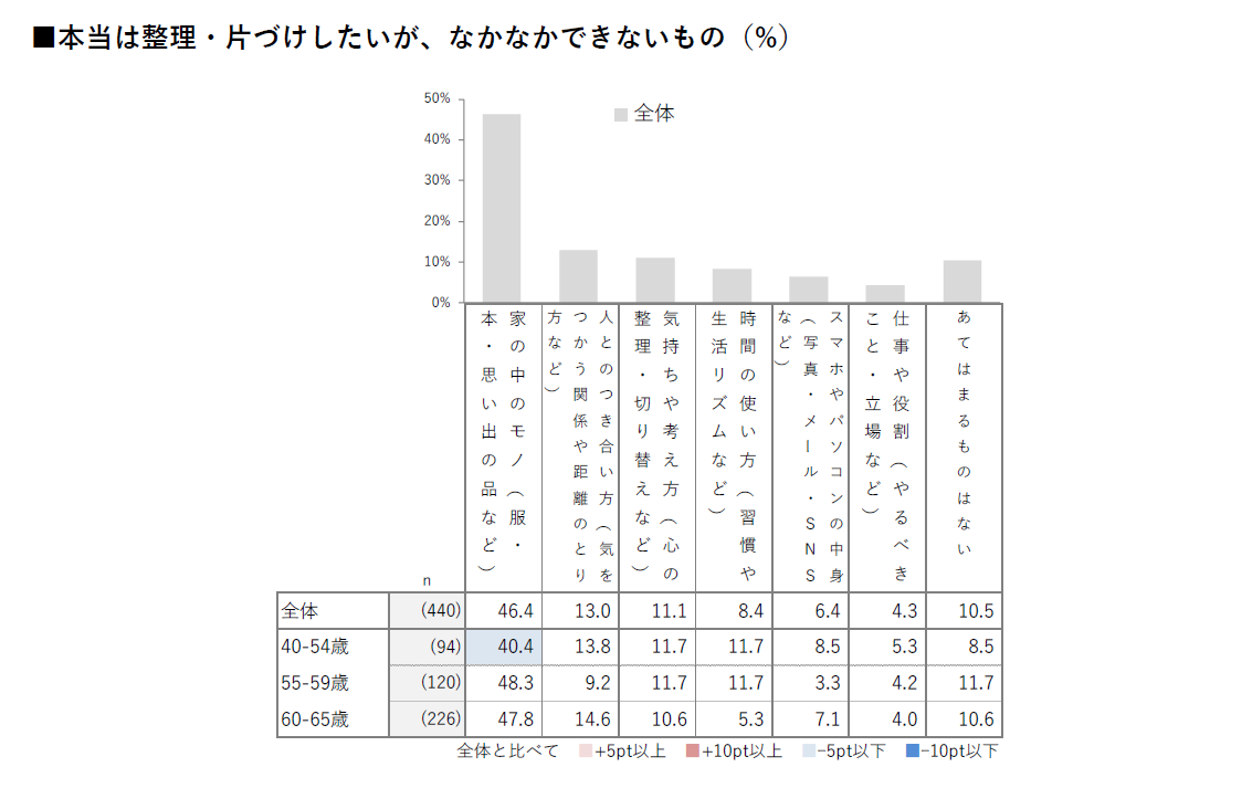 今回の調査では、年代によって“整理の対象”が異なる傾向が見られました。60代は物の整理が中心ですが、40〜50代では生活習慣や気持ちの整理まで広がっています。ライフステージの変化に加え、情報量や人間関係の複雑化が背景にあり、モノ・情報・関係性をどう選び取るかがより重要になっているといえます。